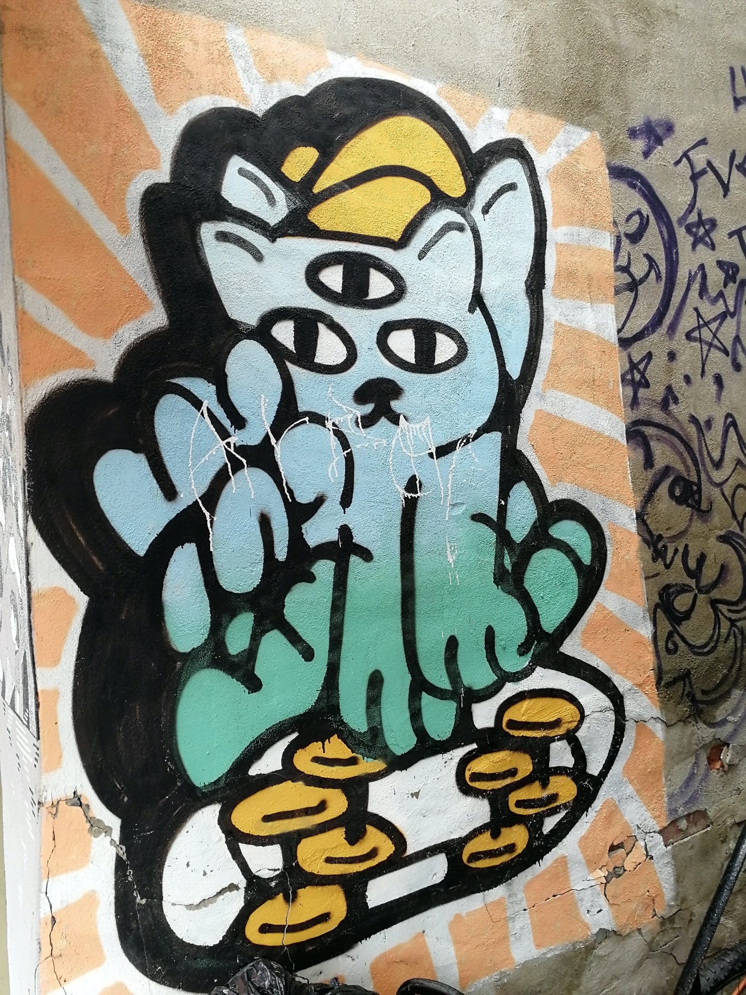 The artwork is of graffiti type. You can admire it in the city of Montréal in Canada and more precisely here : 19 Rue Saint Cuthbert, Montréal, QC H2W 1L2, Canada.