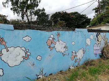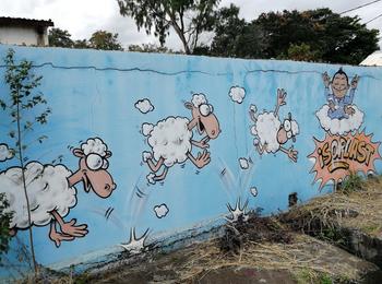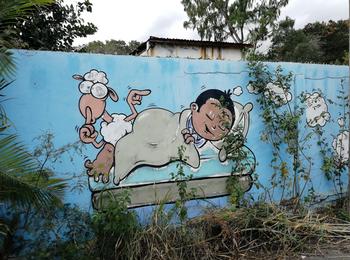 The artwork is of graffiti type. You can admire it in the city of Saint-Pierre in Réunion and more precisely here : Allee De La Zone, Réunion.