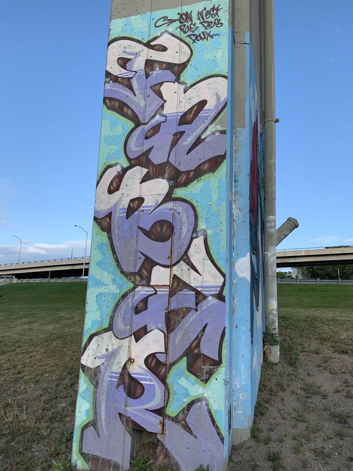 The artwork is of graffiti type. You can admire it in the city of Québec in Canada and more precisely here : 32 Autoroute Dufferin-Montmorency, Québec, QC G1K 3K8, Canada.
