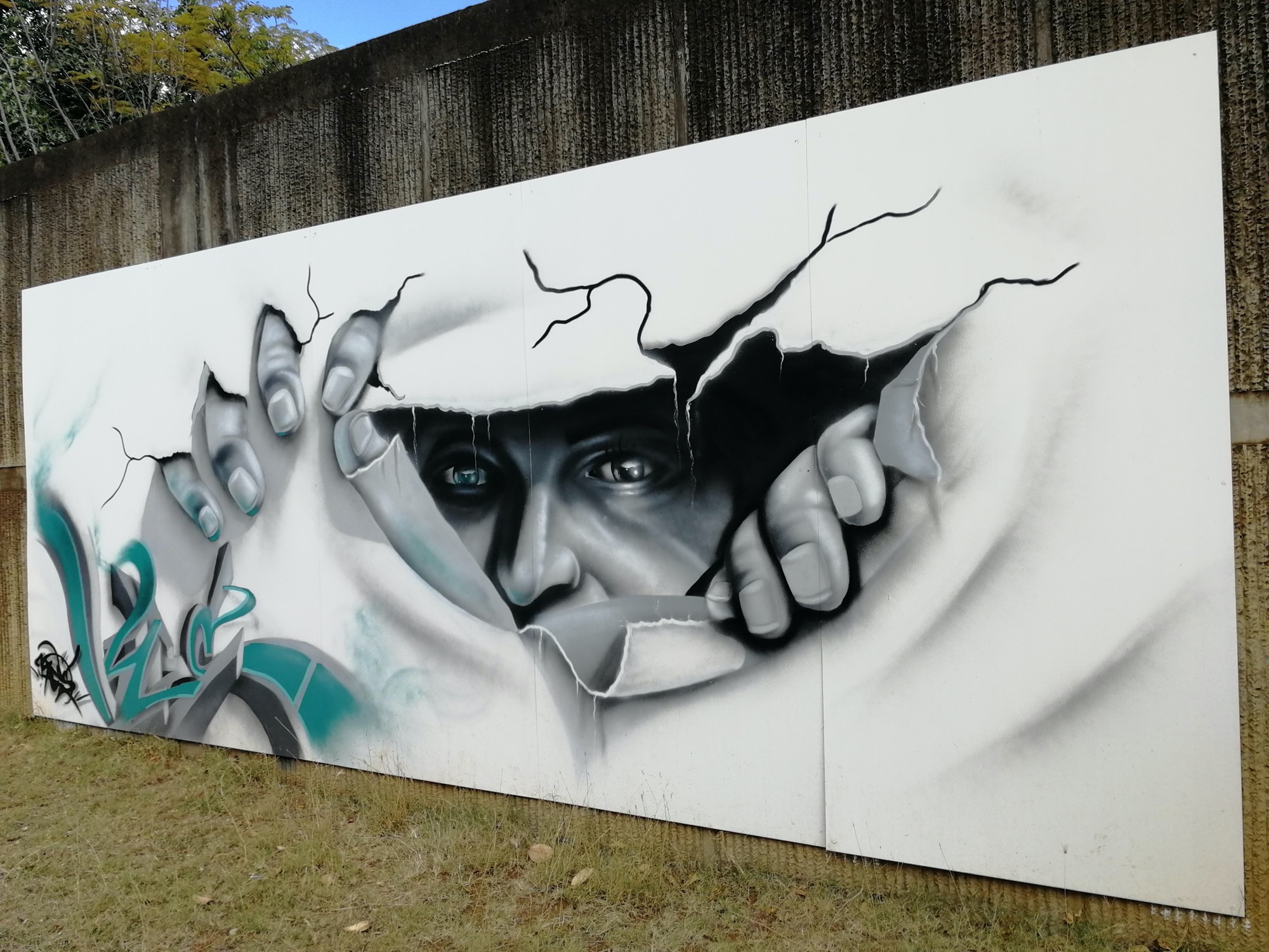 The artwork is of graffiti type. You can admire it in the city of Saint-Pierre in Réunion and more precisely here : 112 Rue Francois de Mahy, Saint-Pierre, Réunion.