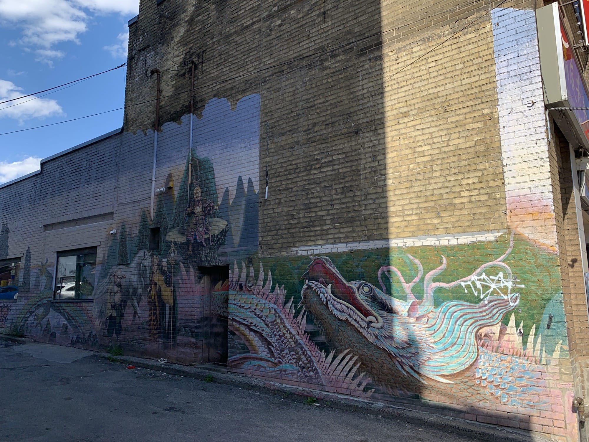 The artwork is of graffiti type. You can admire it in the city of Toronto in Canada and more precisely here : 492 Dundas St W, Toronto, ON M5T 1G9, Canada.