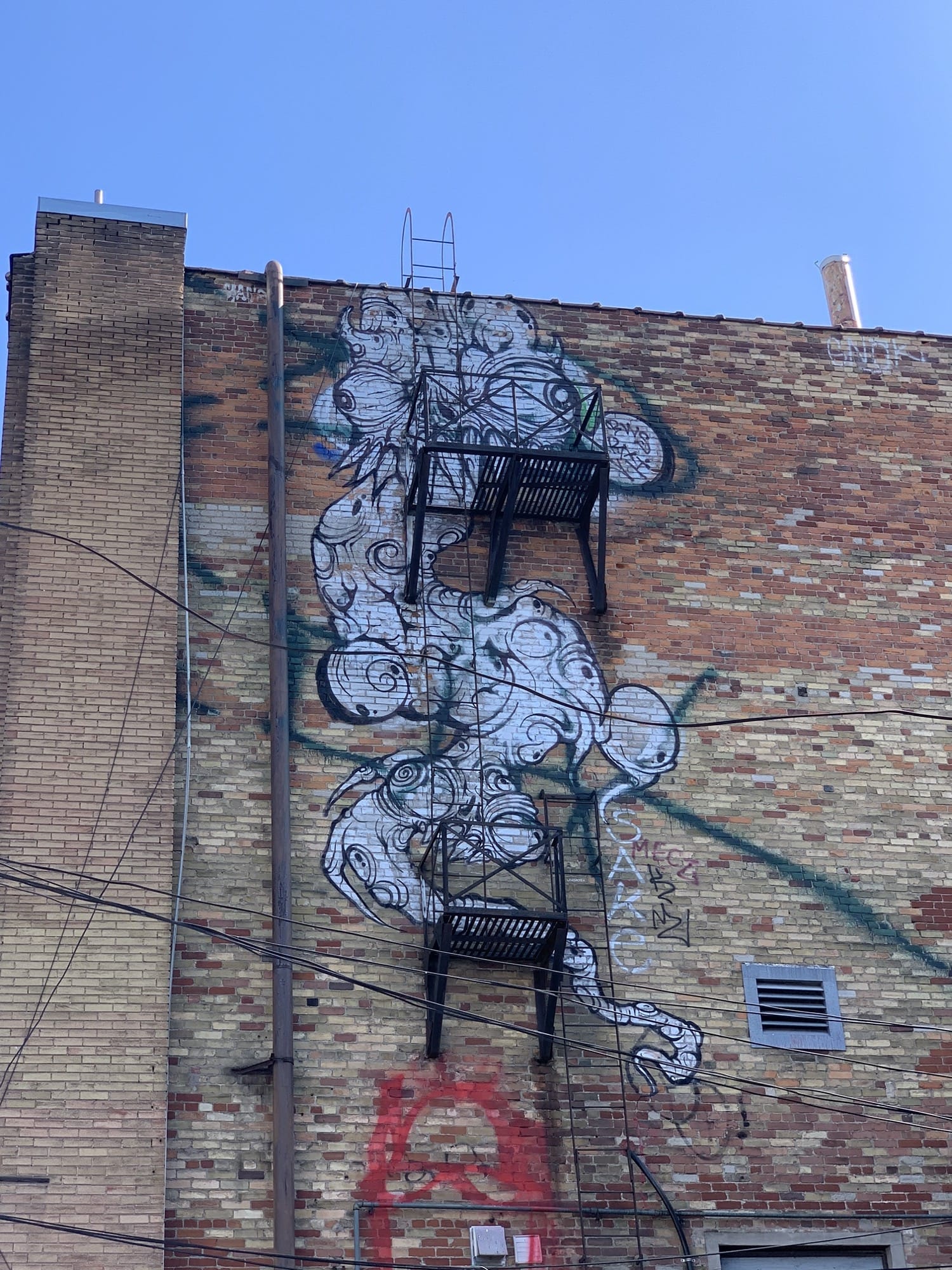 The artwork is of graffiti type. You can admire it in the city of Toronto in Canada and more precisely here : 482 A Dundas St W, Toronto, ON M5T 1G9, Canada.