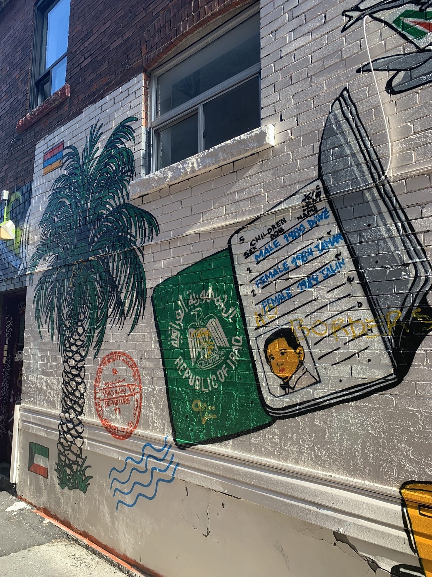The artwork is of graffiti type. You can admire it in the city of Toronto in Canada and more precisely here : 275 Augusta Ave, Toronto, ON M5T 2M1, Canada.