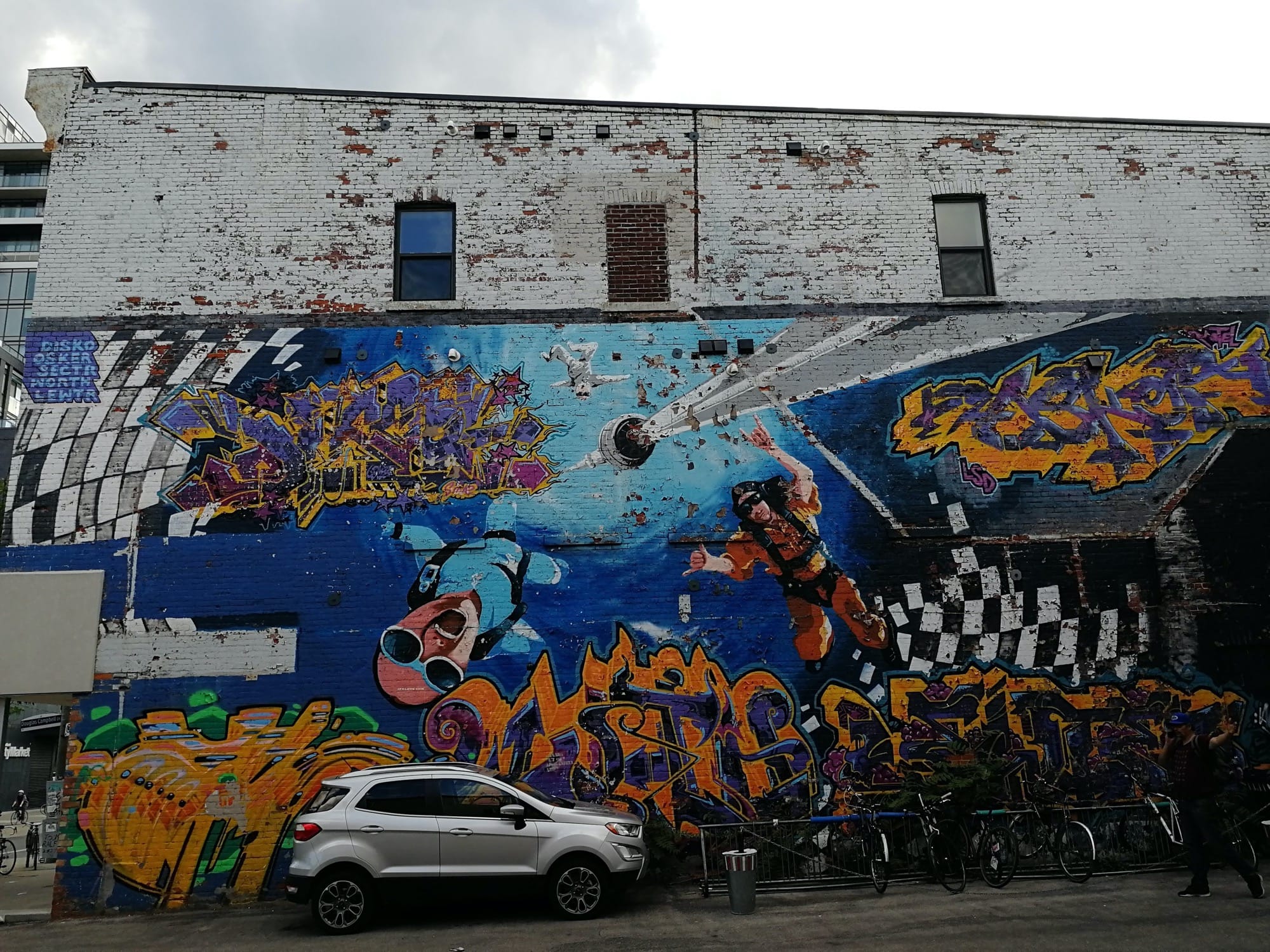 The artwork is of graffiti type. You can admire it in the city of Toronto in Canada and more precisely here : 280 College St, Toronto, ON M5T 1R9, Canada.
