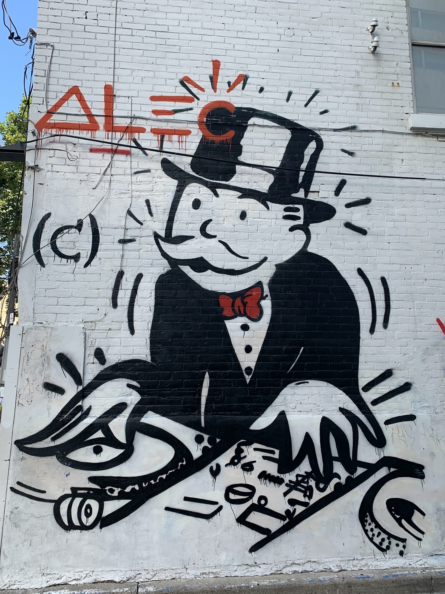 The artwork is of graffiti type. You can admire it in the city of Toronto in Canada and more precisely here : 70 Portland St, Toronto, ON M5V 2M9, Canada.