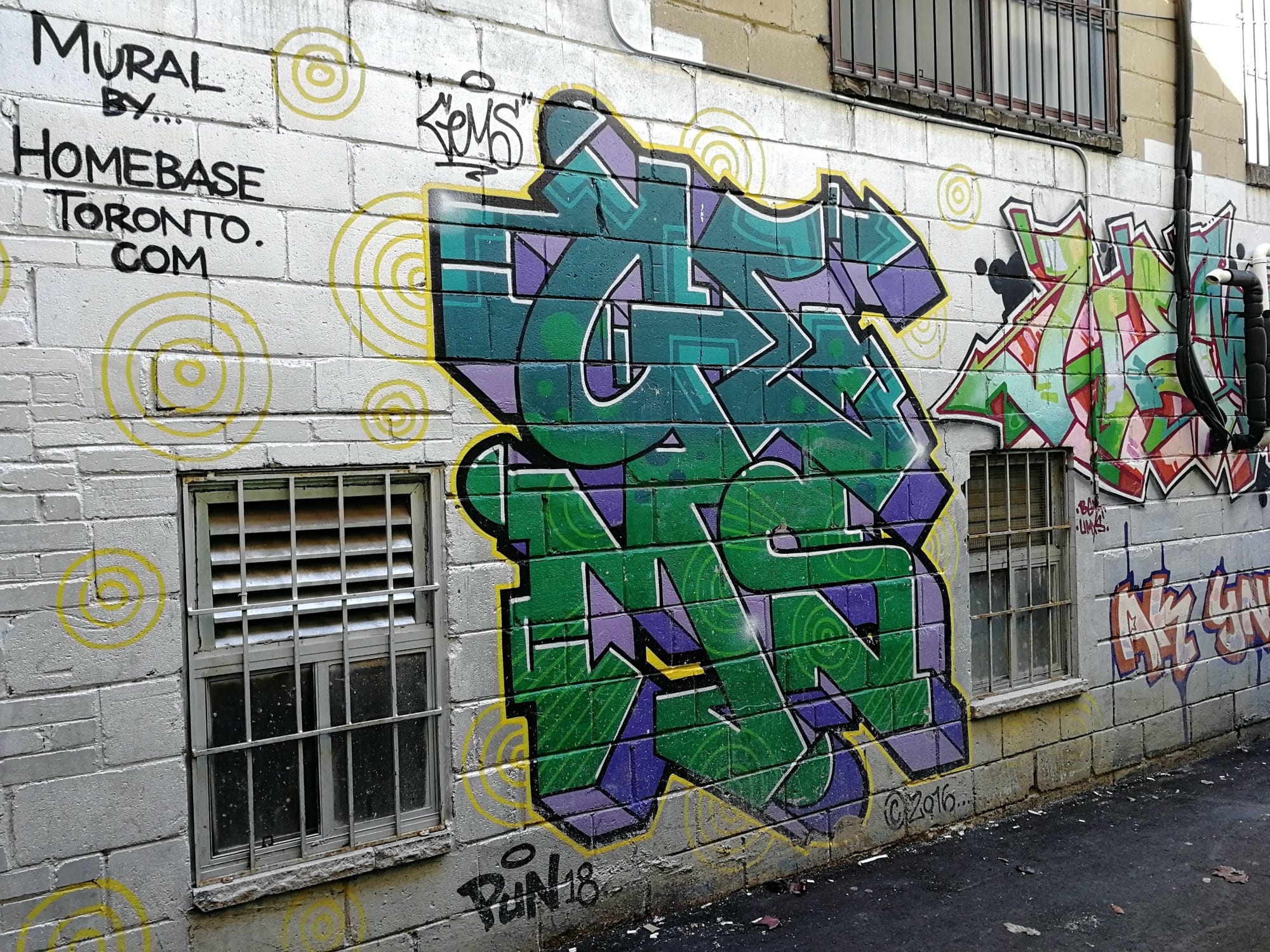 The artwork is of graffiti type. You can admire it in the city of Toronto in Canada and more precisely here : 106 Portland St, Toronto, ON M5V 2N3, Canada.