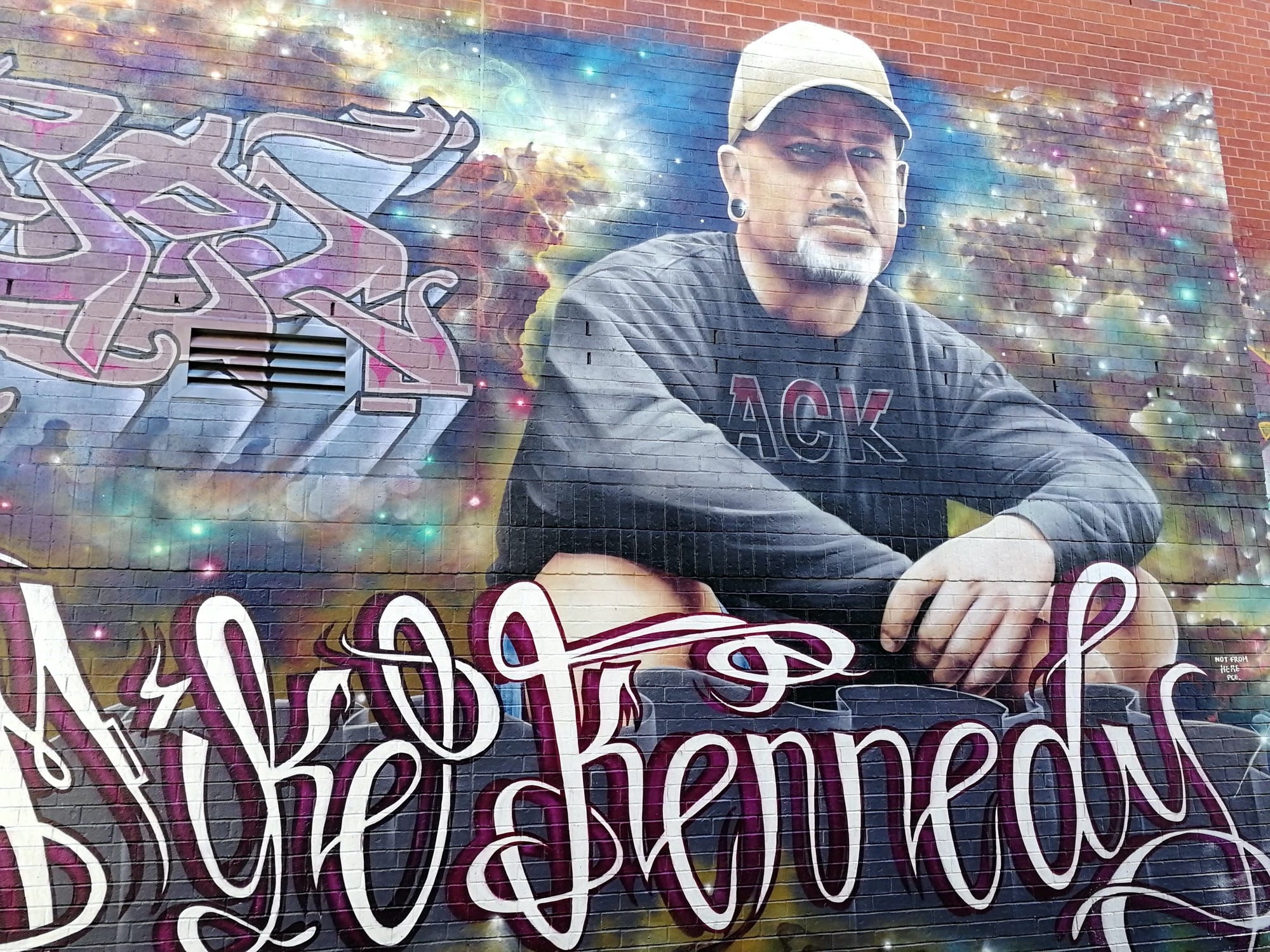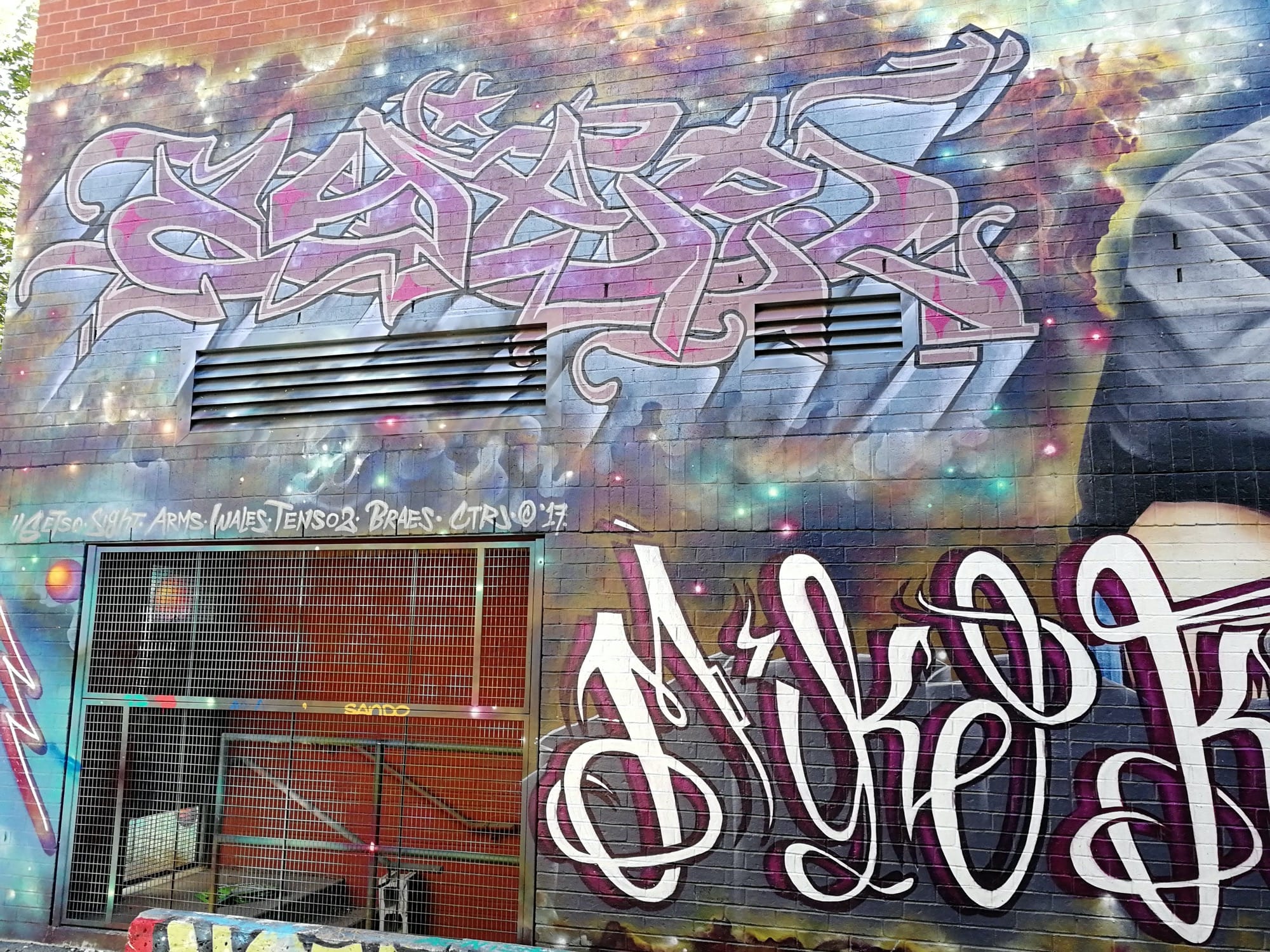 The artwork is of graffiti type. You can admire it in the city of Toronto in Canada and more precisely here : 162 Portland St, Toronto, ON M5V 2B6, Canada.