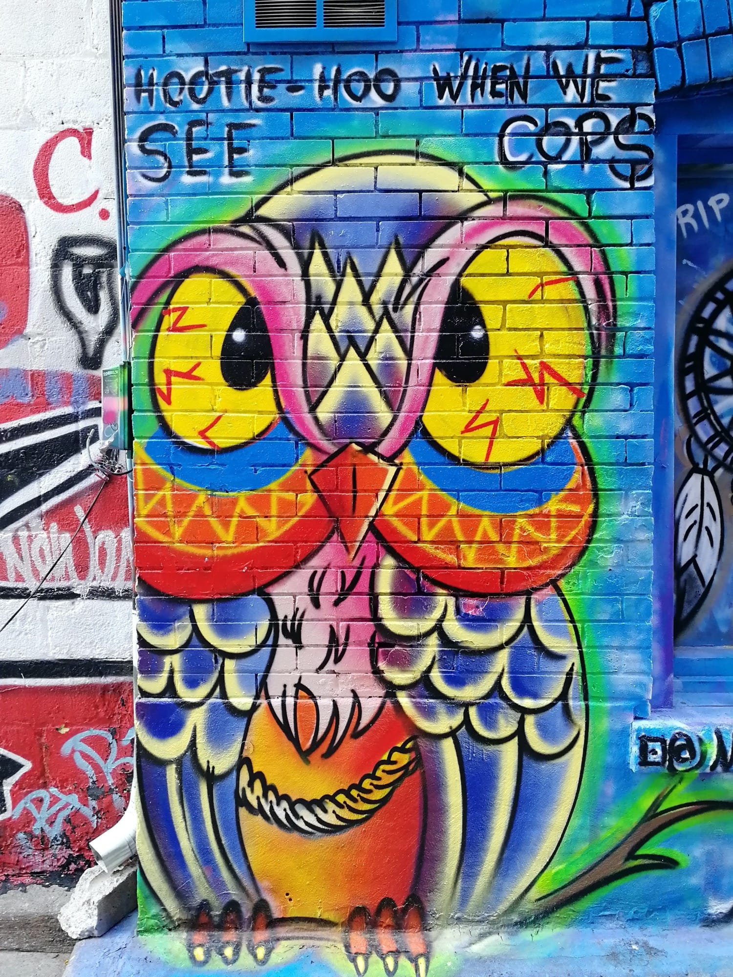 The artwork is of graffiti type. You can admire it in the city of Toronto in Canada and more precisely here : 569 Queen St W, Toronto, ON M5V 2B6, Canada.