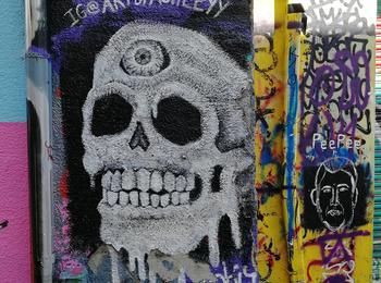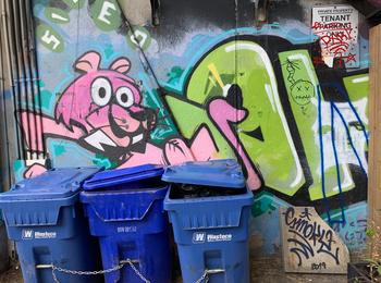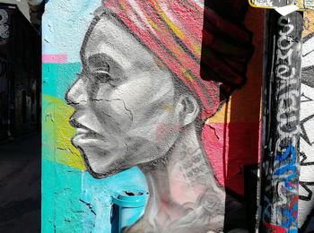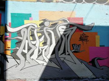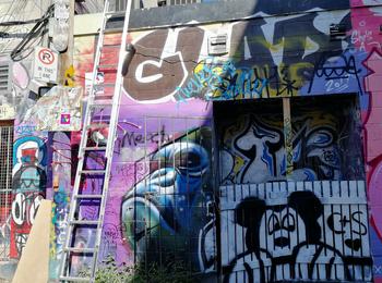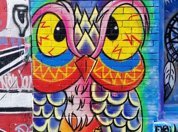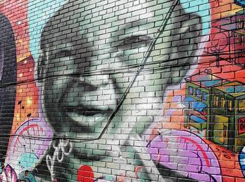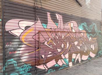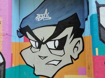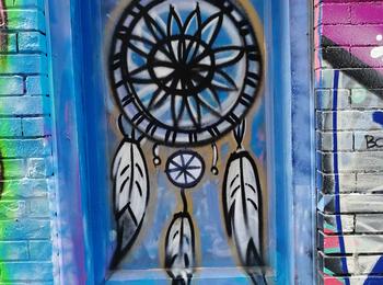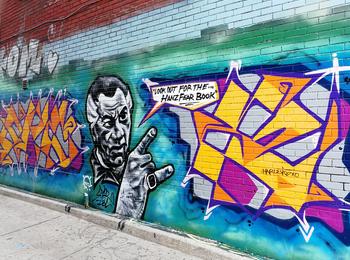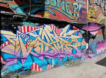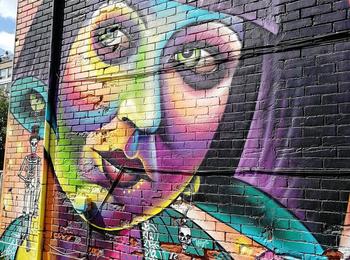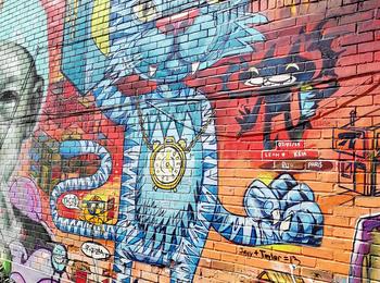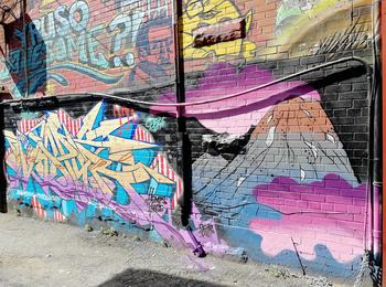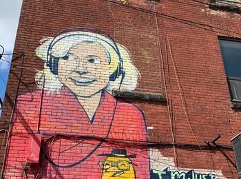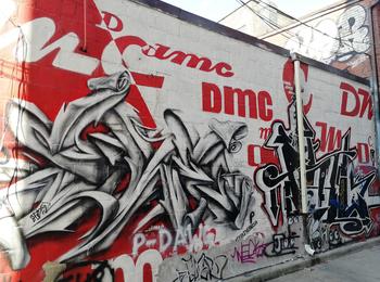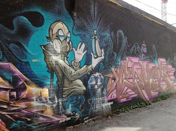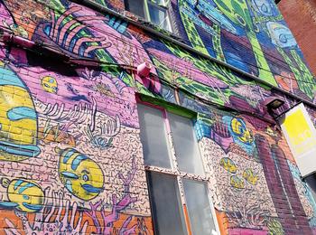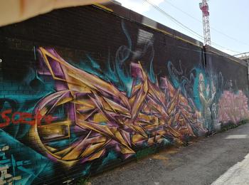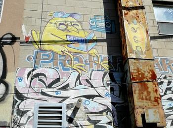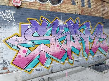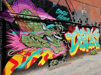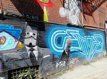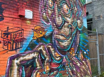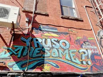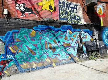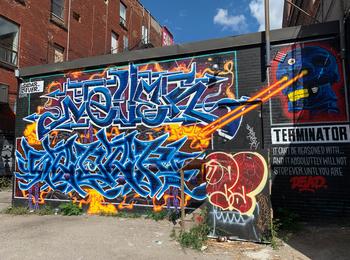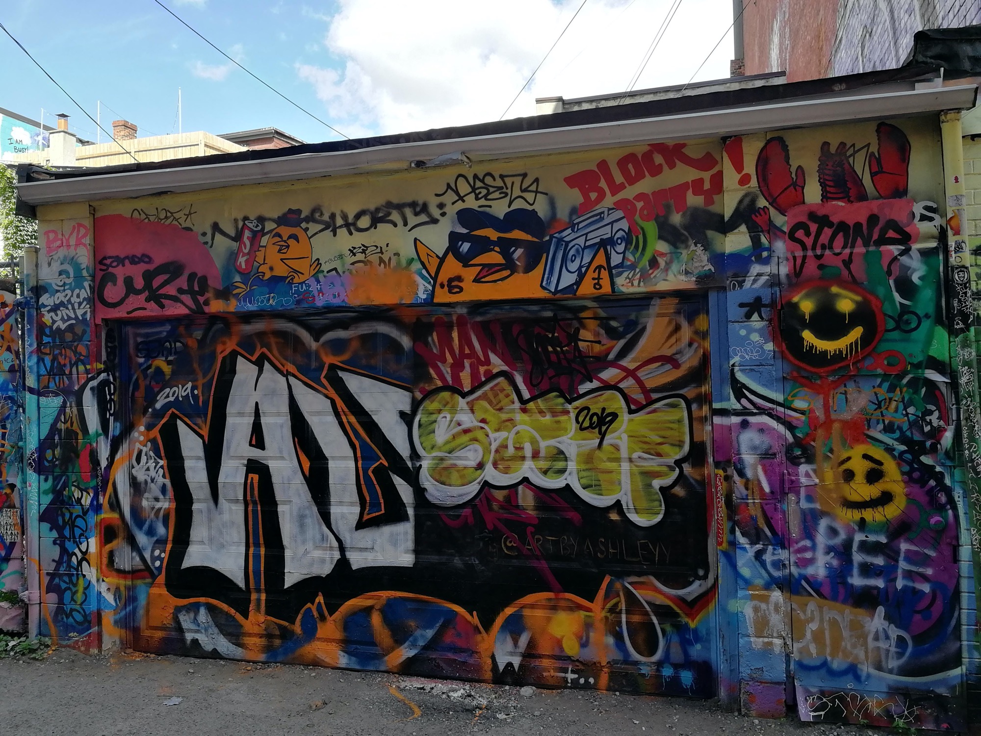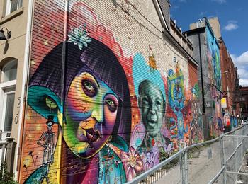 The artwork is of graffiti type. You can admire it in the city of Toronto in Canada and more precisely here : 530 R Richmond St W, Toronto, ON M5V 1Y4, Canada.
