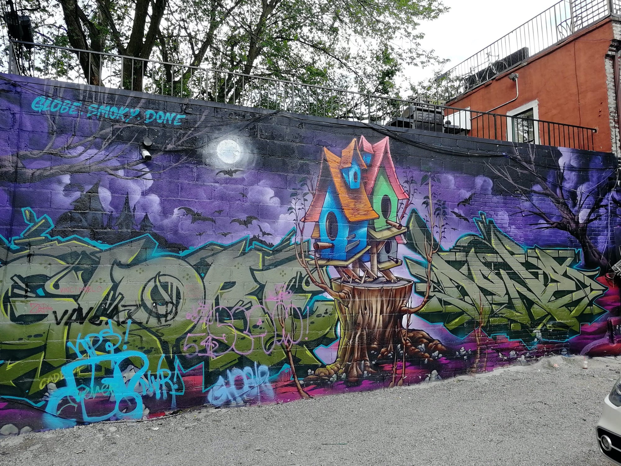The artwork is of graffiti type. You can admire it in the city of Toronto in Canada and more precisely here : 525 Queen St W, Toronto, ON M5V 2B4, Canada.