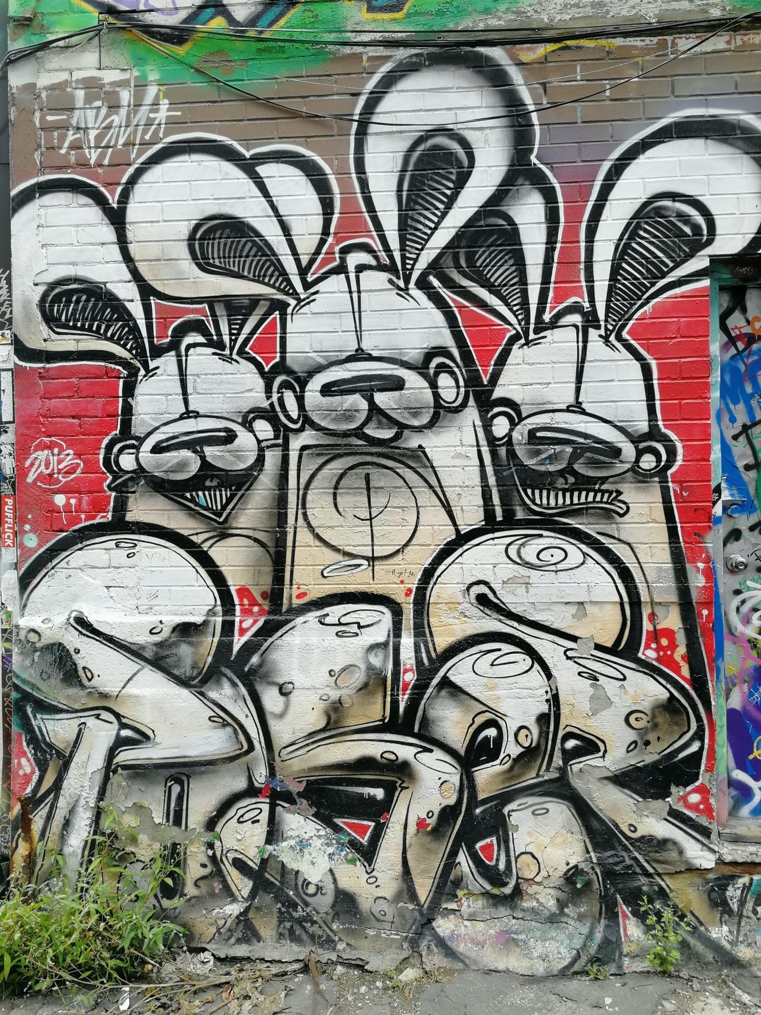 The artwork is of graffiti type. You can admire it in the city of Toronto in Canada and more precisely here : 515 Queen St W, Toronto, ON M5V 2B4, Canada.