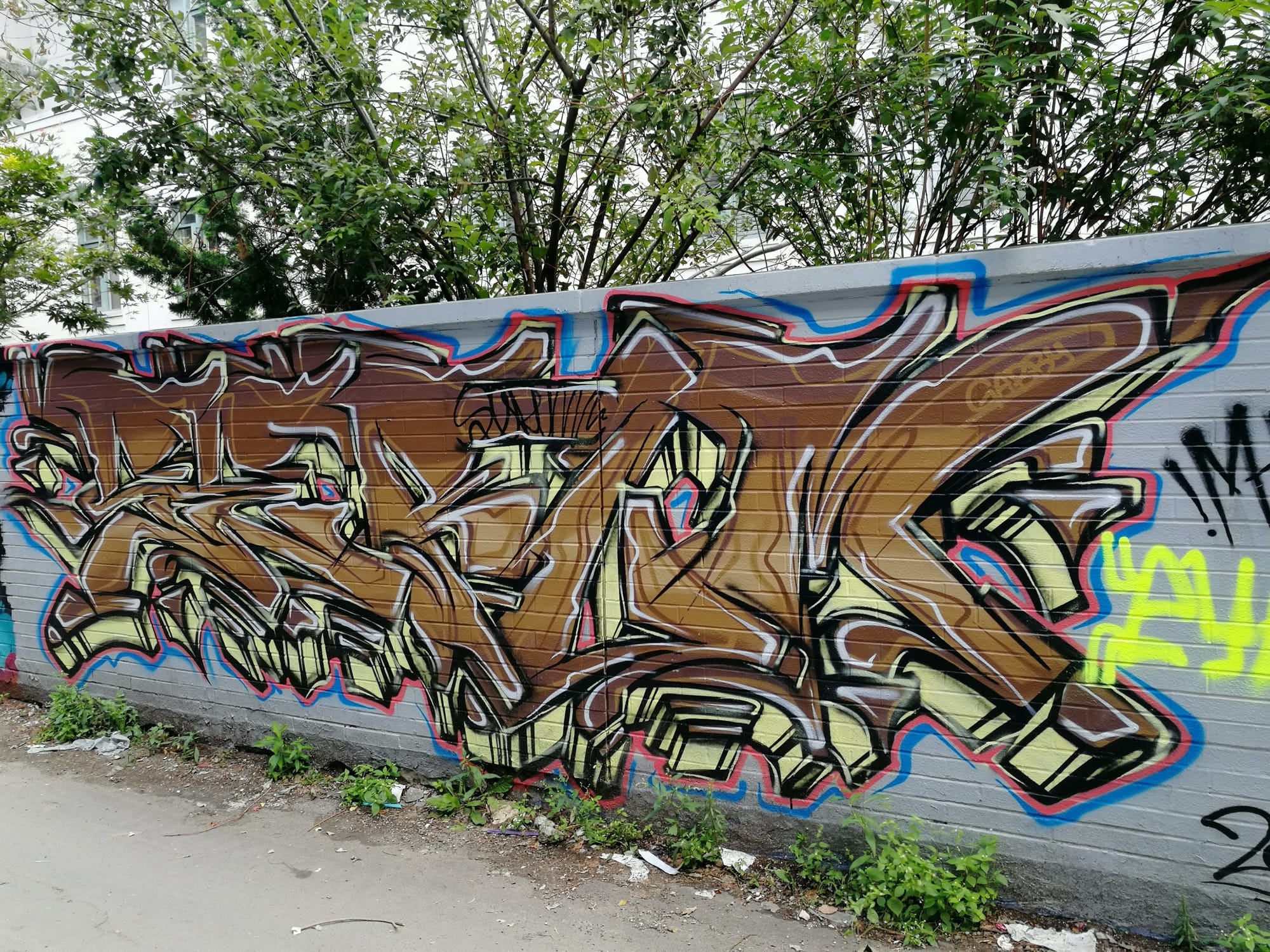 The artwork is of graffiti type. You can admire it in the city of Toronto in Canada and more precisely here : 519 Queen St W, Toronto, ON M5V 2B4, Canada.