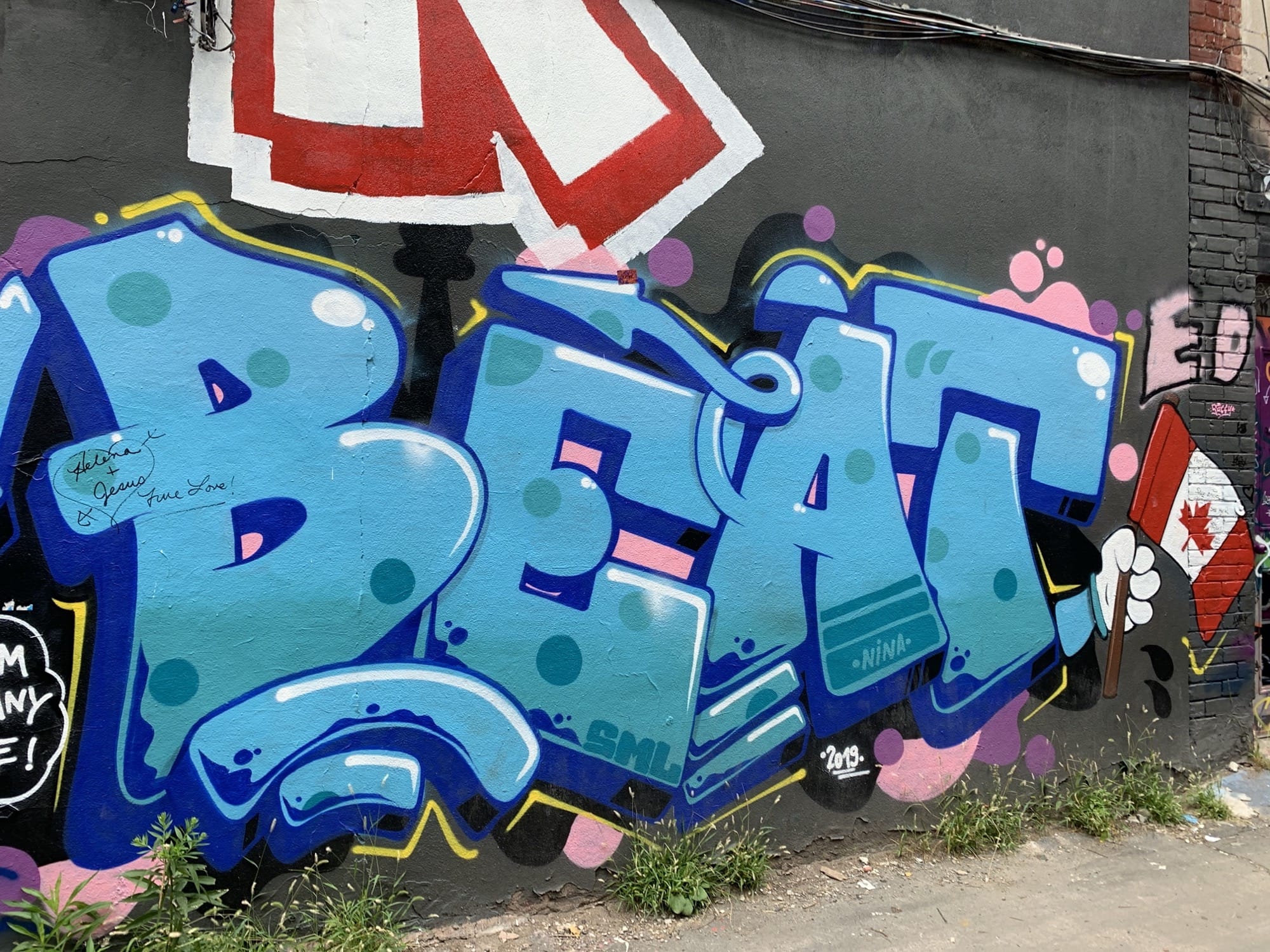 The artwork is of graffiti type. You can admire it in the city of Toronto in Canada and more precisely here : 488 Richmond St W, Toronto, ON M5V 1Y2, Canada.