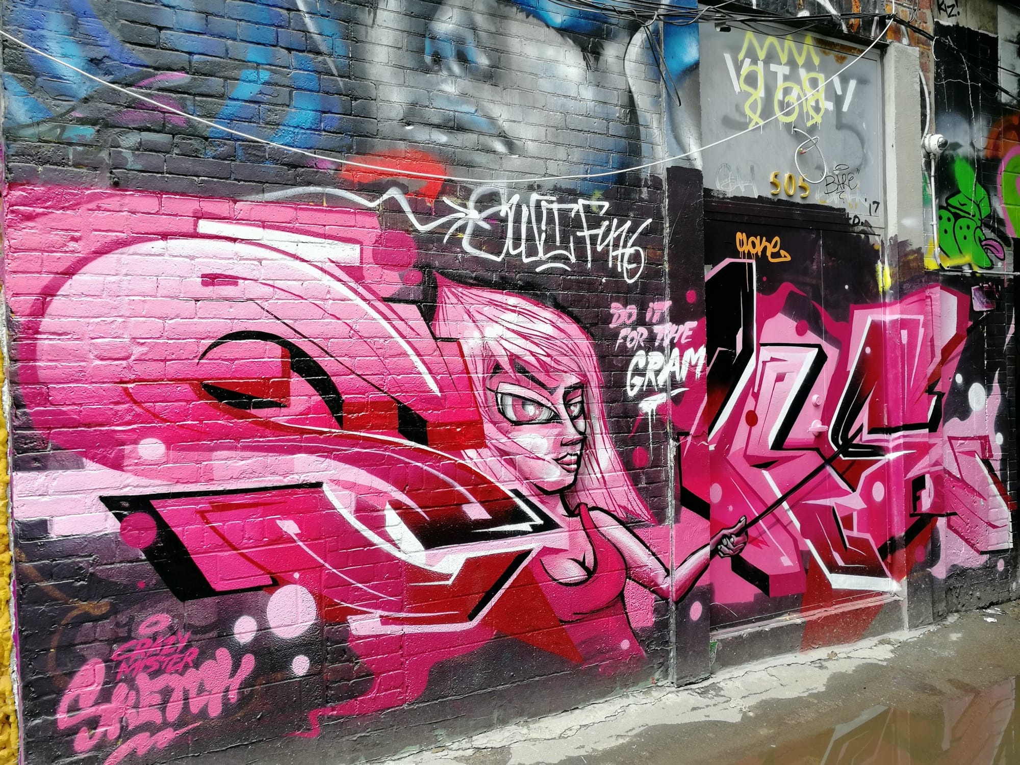 The artwork is of graffiti type. You can admire it in the city of Toronto in Canada and more precisely here : 488 Richmond St W, Toronto, ON M5V 1Y2, Canada.