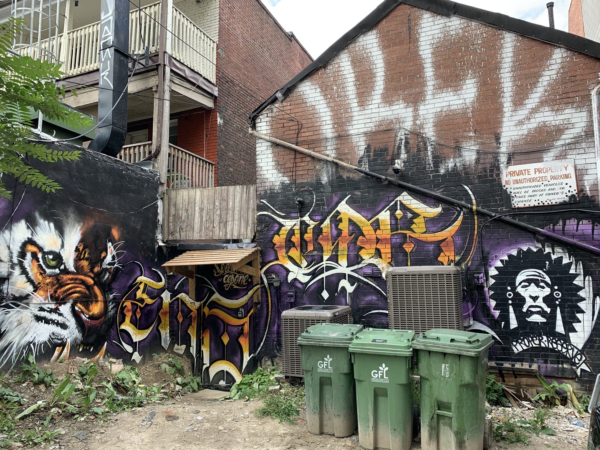 The artwork is of graffiti type. You can admire it in the city of Toronto in Canada and more precisely here : 455 Queen St W, Toronto, ON M5V 2A9, Canada.