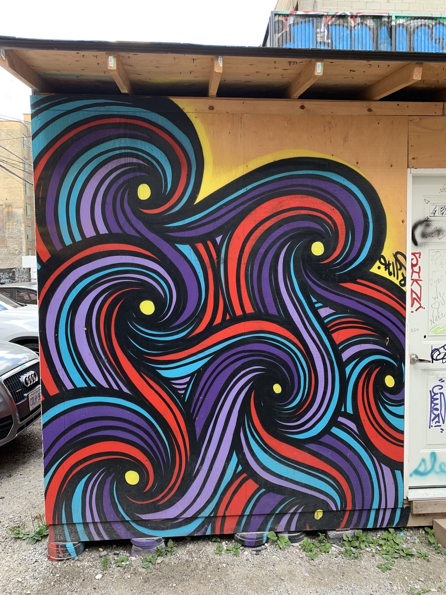 The artwork is of graffiti type. You can admire it in the city of Toronto in Canada and more precisely here : 451 Queen St W, Toronto, ON M5V 2A9, Canada.