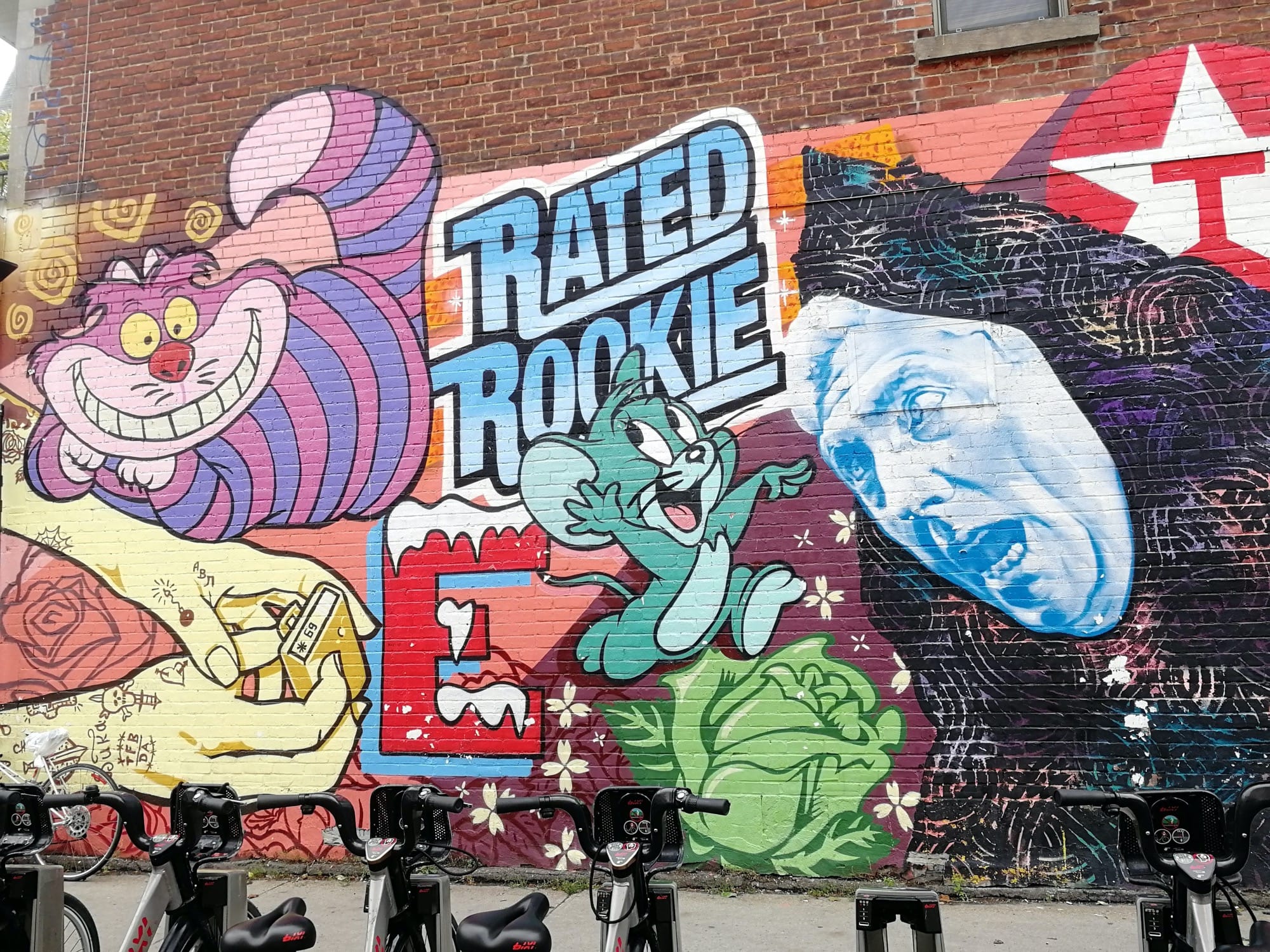 The artwork is of graffiti type. You can admire it in the city of Montréal in Canada and more precisely here : 751 Avenue du Mont-Royal E, Montréal, QC H2J 1W8, Canada.