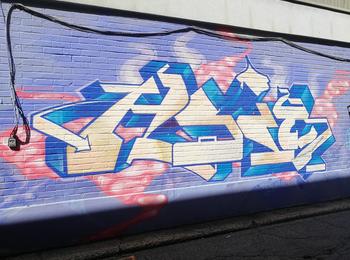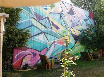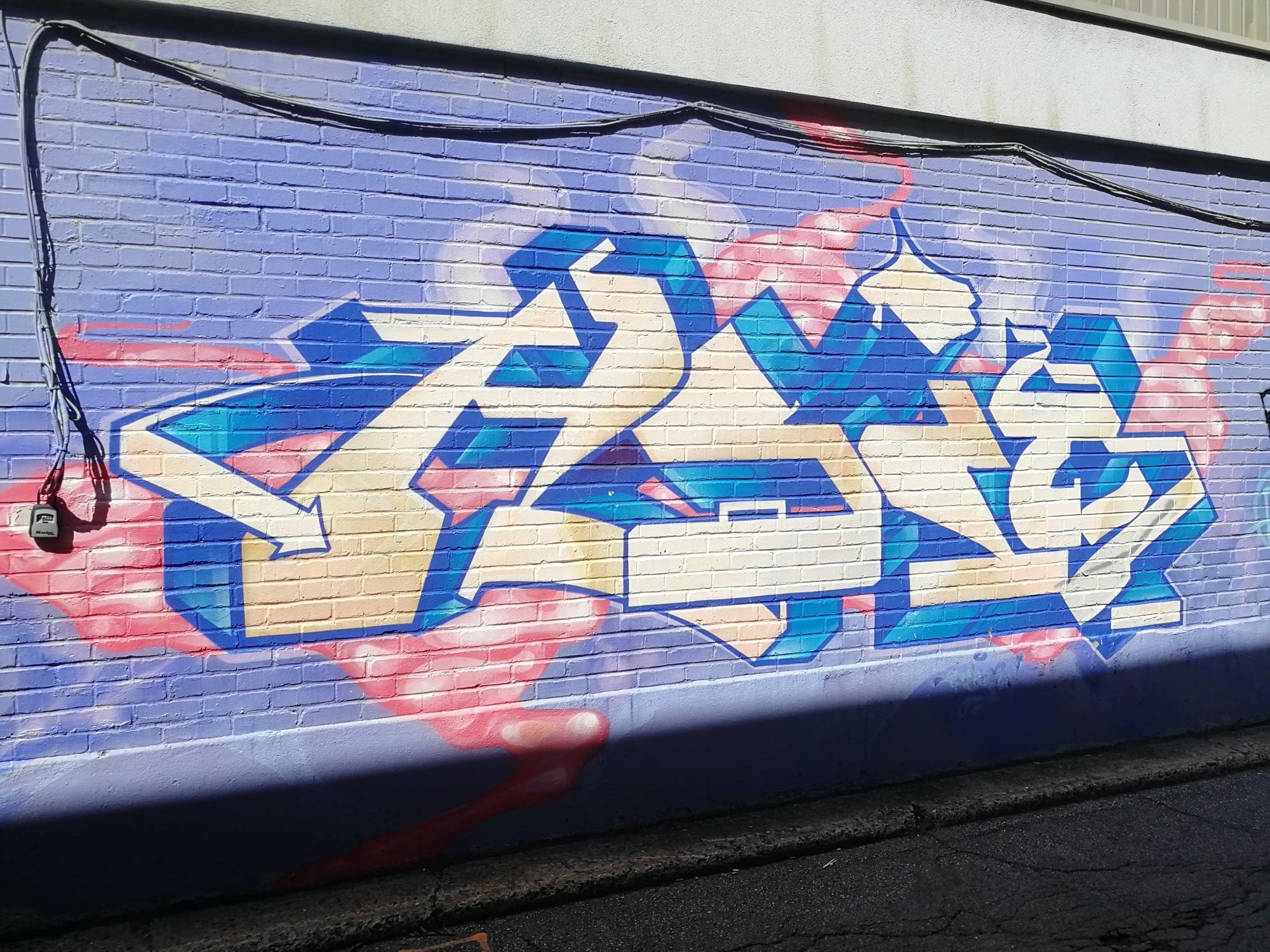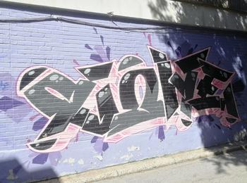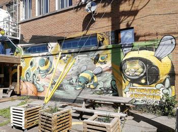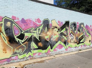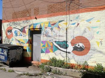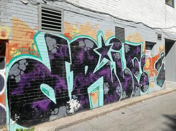 The artwork is of graffiti type. You can admire it in the city of Montréal in Canada and more precisely here : 5375 3e Av, Montréal, QC H1Y 2W4, Canada.