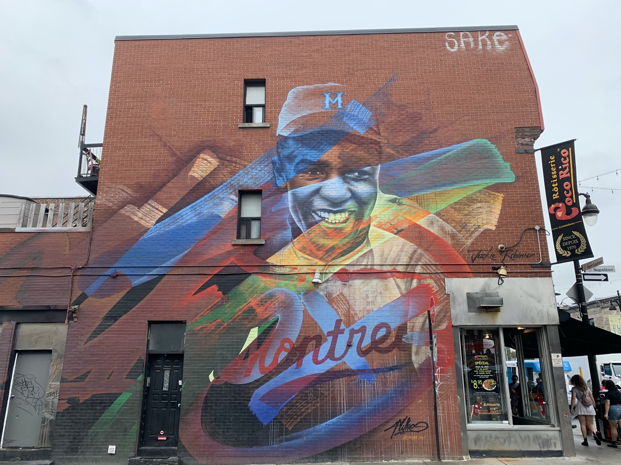 The artwork is of graffiti type. You can admire it in the city of Montréal in Canada and more precisely here : 3907 Boul St-Laurent, Montréal, QC H2W 1X9, Canada.