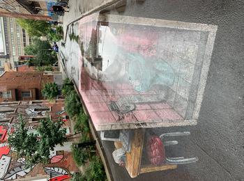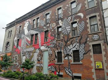 The artwork is of graffiti type. You can admire it in the city of Montréal in Canada and more precisely here : 3697 Boul St-Laurent, Montréal, QC H2X 2V7, Canada.