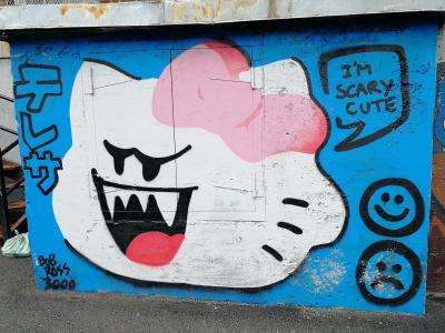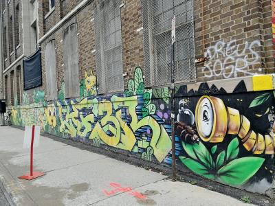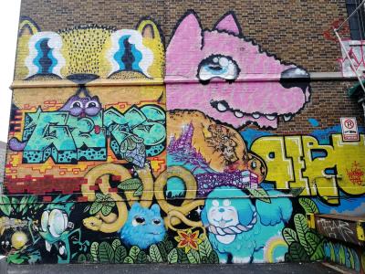The artwork is of type graffiti. You can admire it in the city of Montréal in Canada, more precisely here: 4200 Rue Clark, Montréal, QC H2W 1G2, Canada.