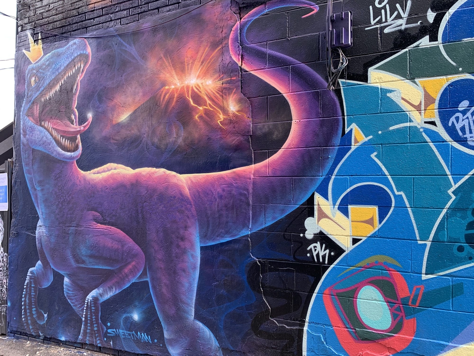 The artwork is of graffiti type. You can admire it in the city of Toronto in Canada and more precisely here : 52 Kensington Ave, Toronto, ON M5T 2K1, Canada.