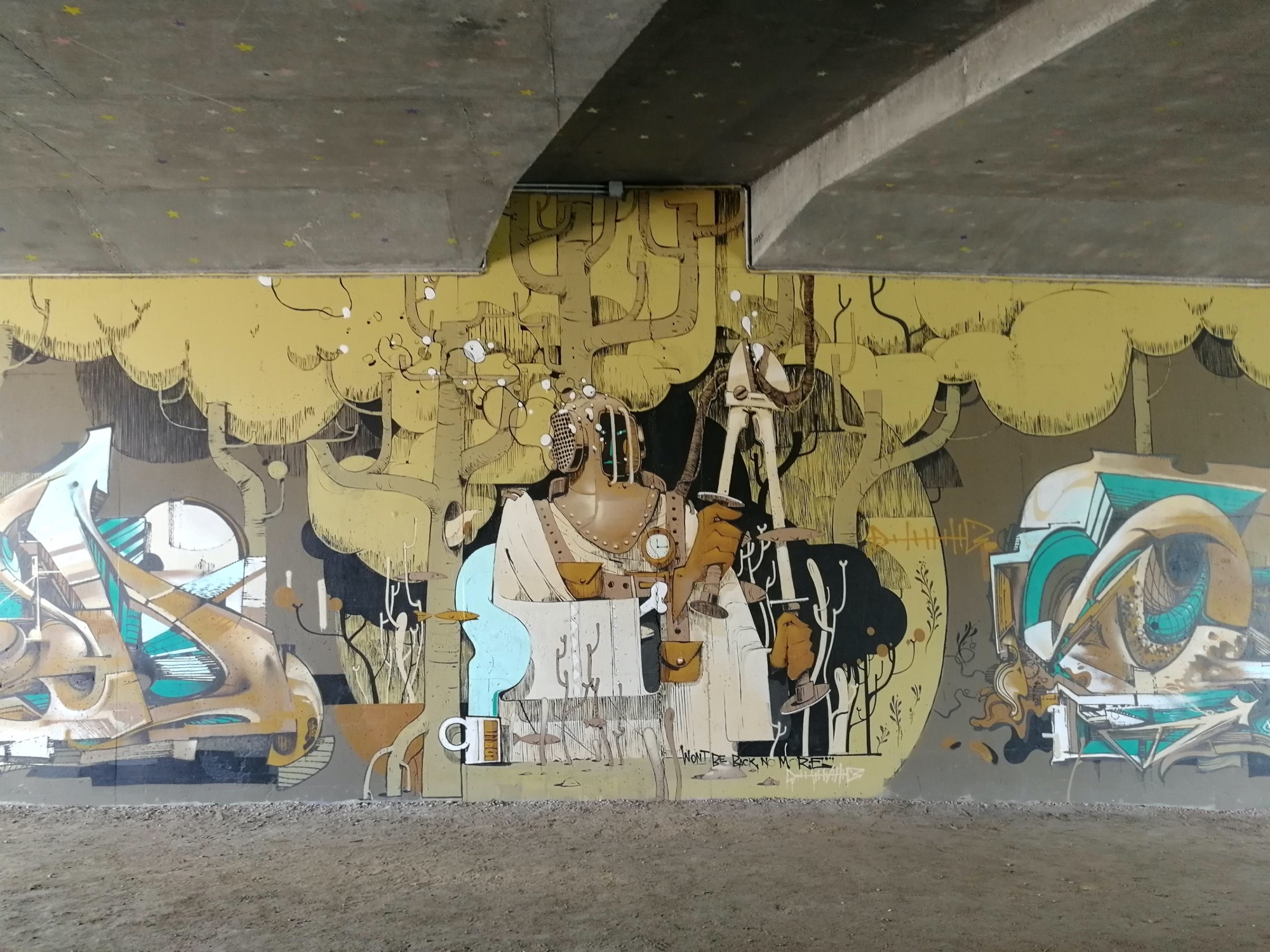 The artwork is of graffiti type. You can admire it in the city of Vannes in France and more precisely here : 34b Rue du 8 Mai 1945, 56000 Vannes, France.