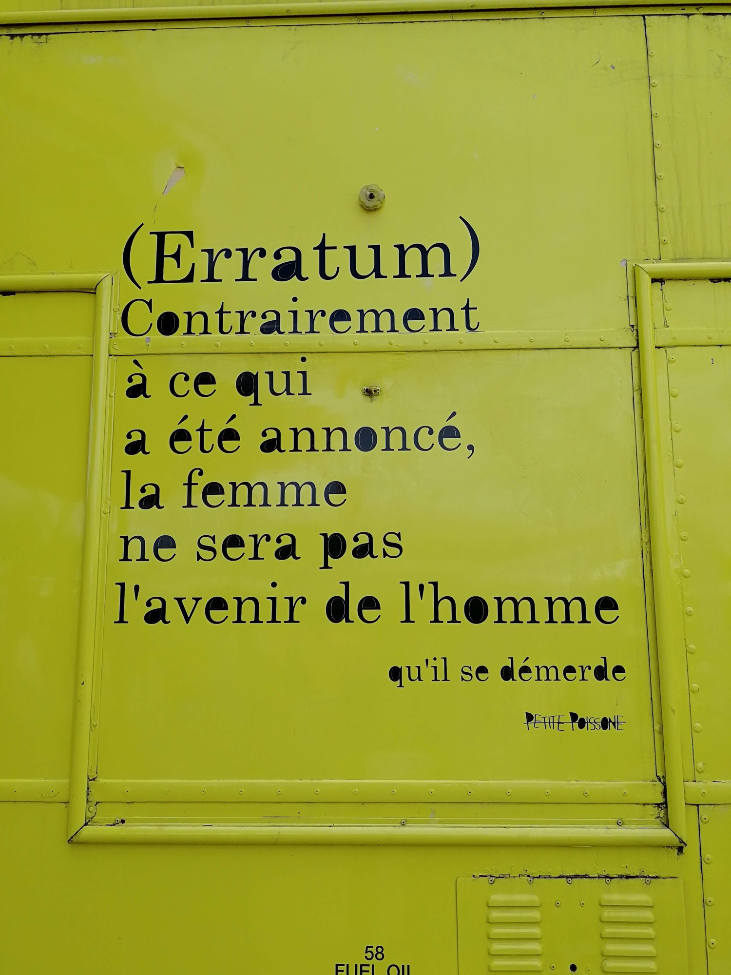 The artwork La femme ne sera pas l'avenir de l'homme, qu'il se démerde is of sticking type. You can admire it in the city of Rezé in France and more precisely here : Boulevard du Général de Gaulle, 44400 Rezé, France.