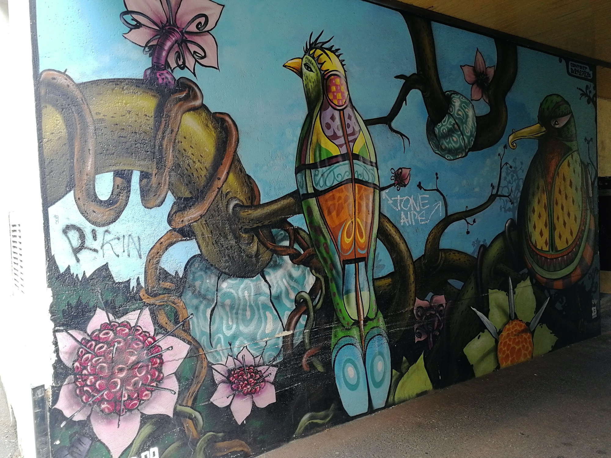 The artwork is of graffiti type. You can admire it in the city of Rennes in France and more precisely here : 9 Rue de Châteaudun, 35000 Rennes, France.