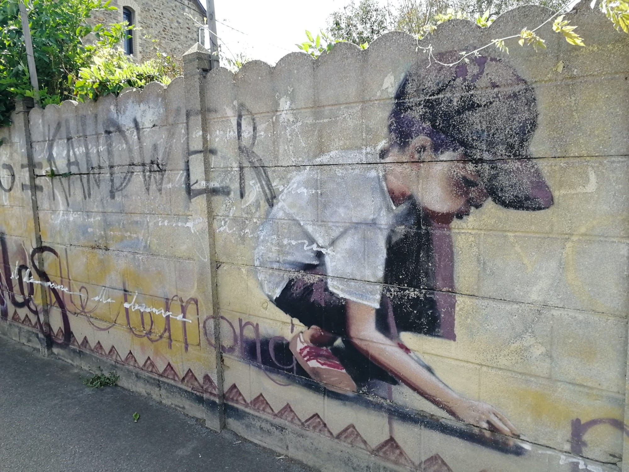 The artwork is of graffiti type. You can admire it in the city of Rennes in France and more precisely here : 229 Rue de Nantes, 35200 Rennes, France.