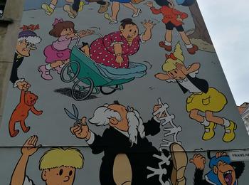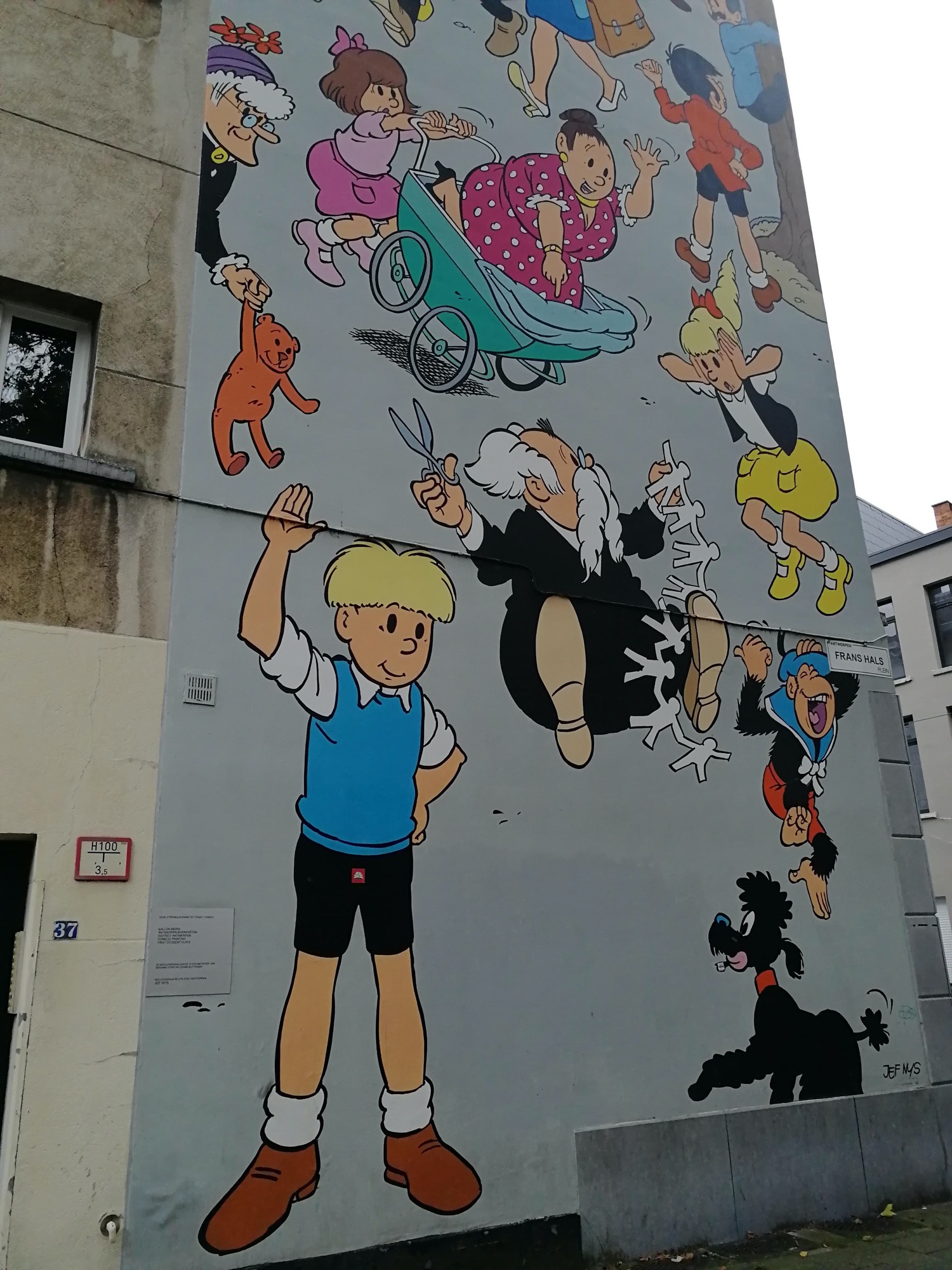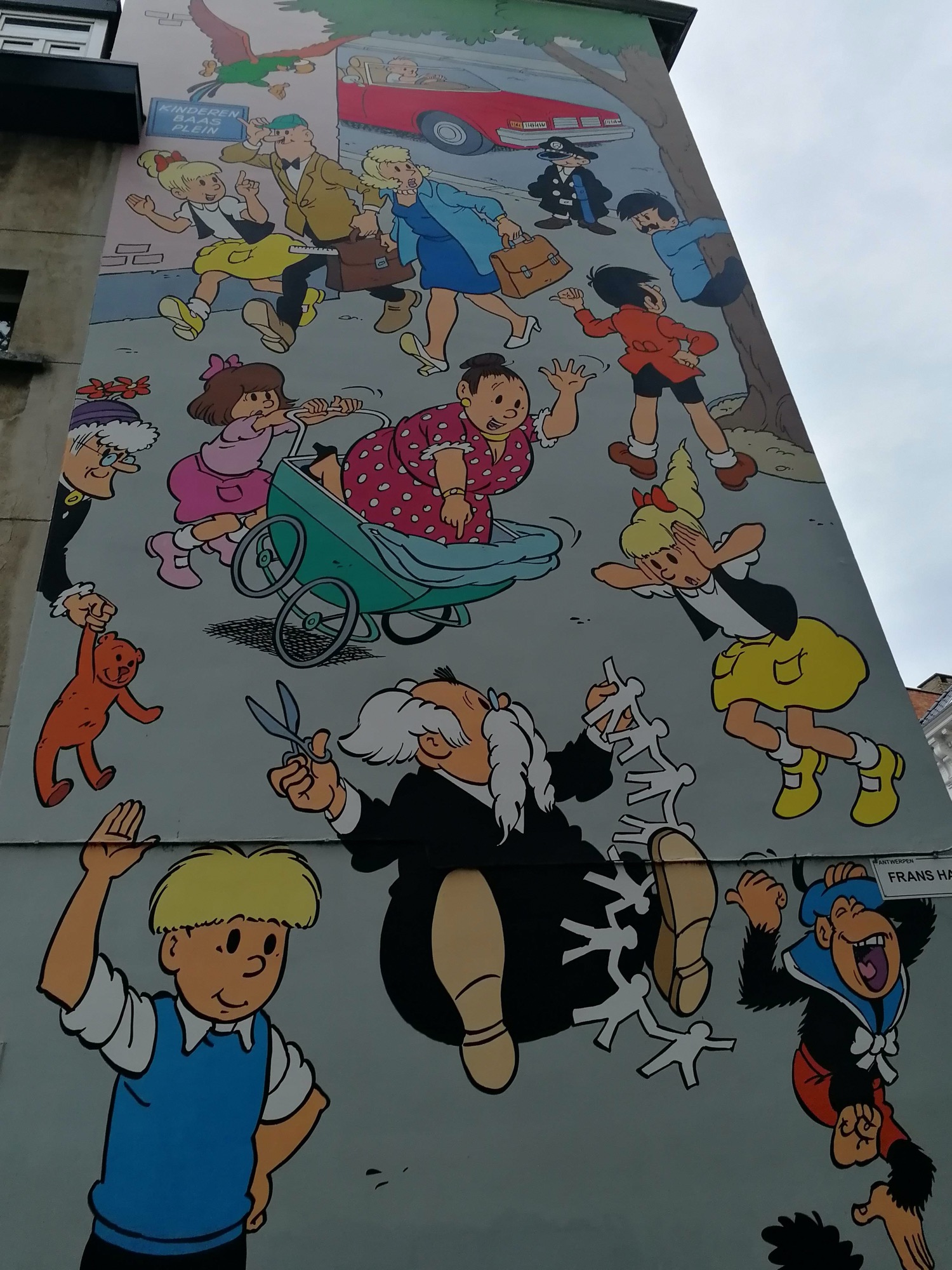 The artwork is of graffiti type. You can admire it in the city of Antwerpen in Belgium and more precisely here : Sint-Jacobsmarkt 39, 2000 Antwerpen, Belgique.