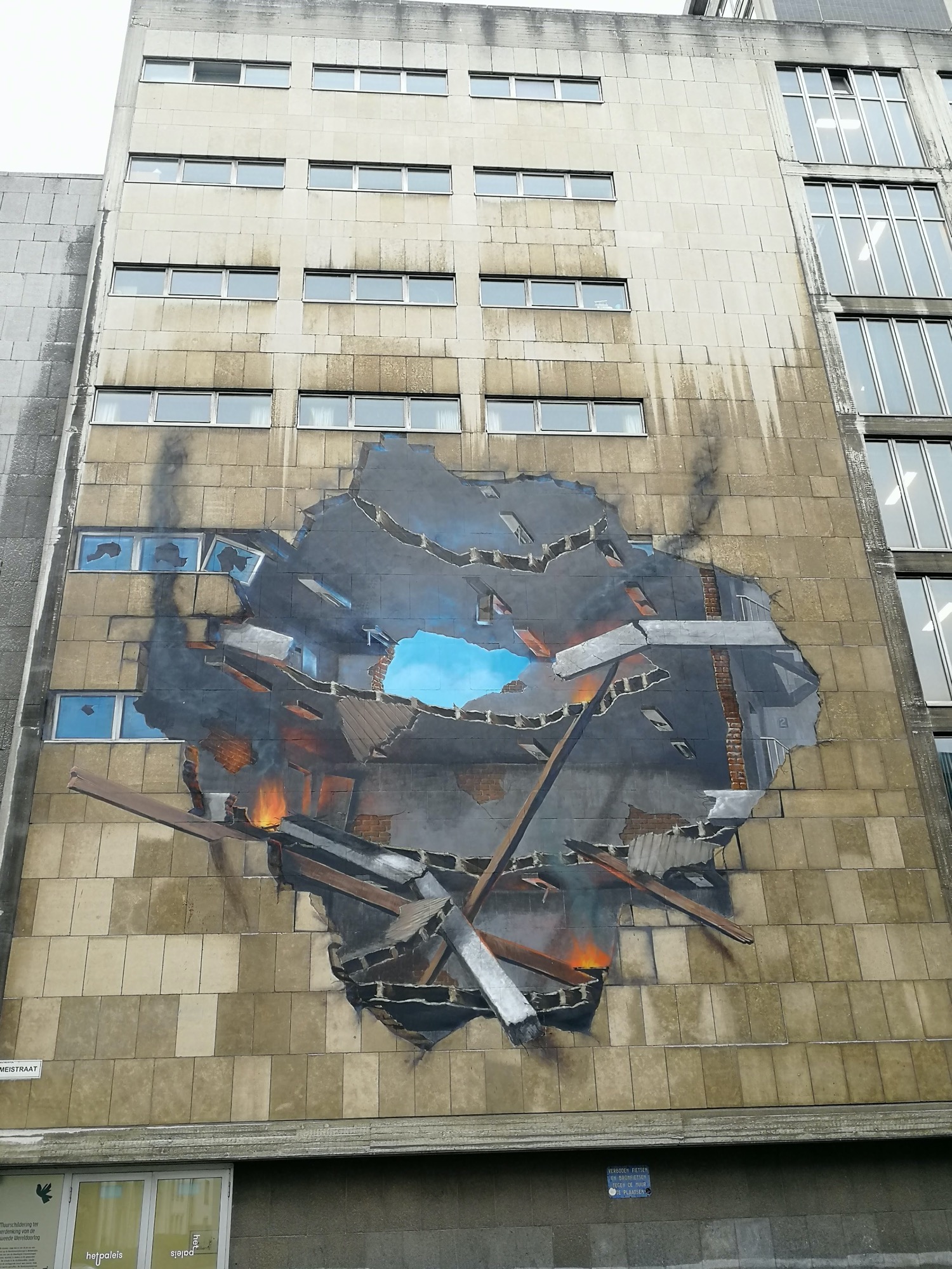 The artwork is of graffiti type. You can admire it in the city of Antwerpen in Belgium and more precisely here : Lammekensraamveld 2, 2000 Antwerpen, Belgique.
