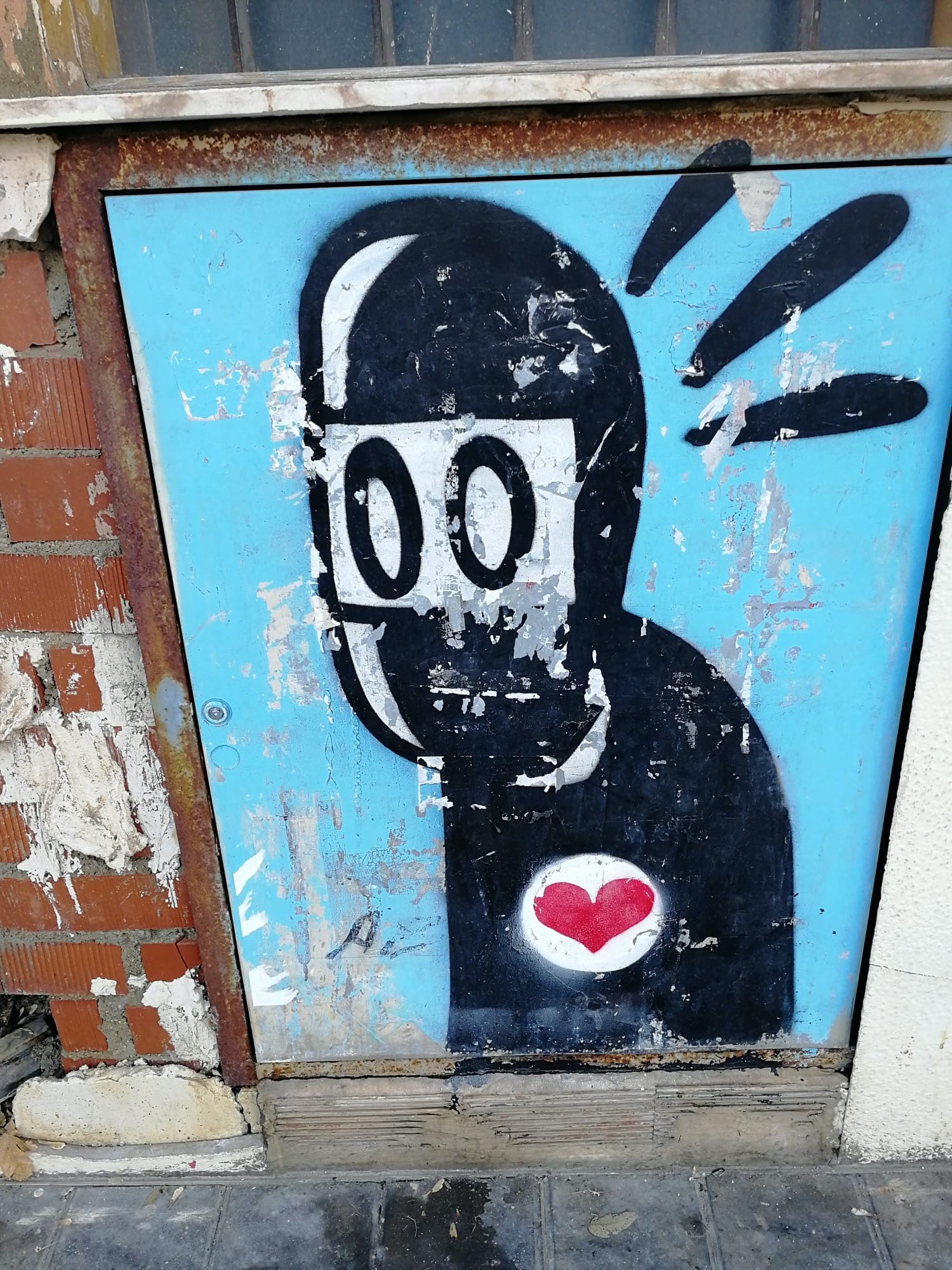 The artwork is of graffiti type. You can admire it in the city of València in Spain and more precisely here : Plaça de Tavernes de Valldigna, 2, 46003 València, Valencia, Espagne.