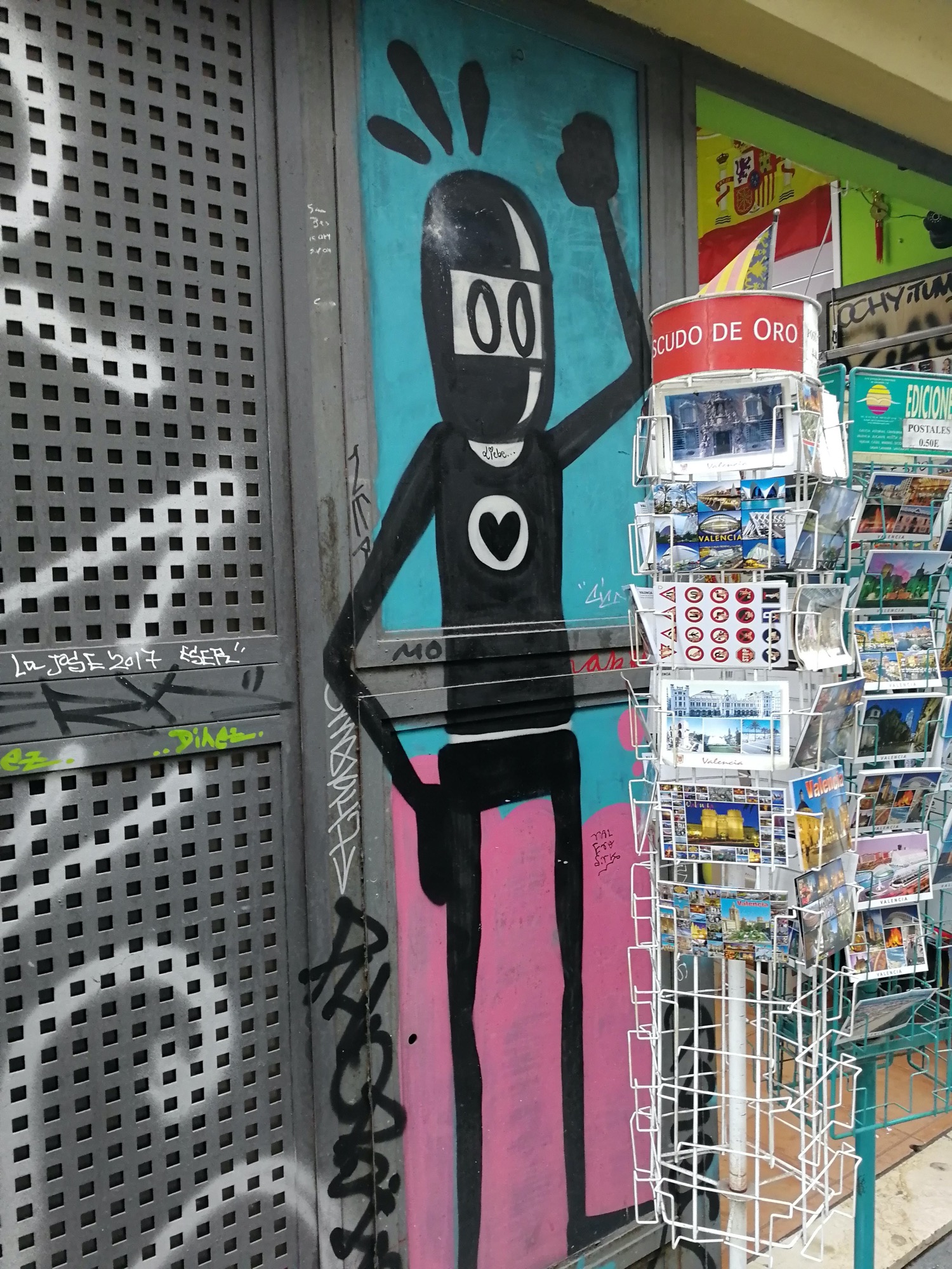 The artwork is of graffiti type. You can admire it in the city of València in Spain and more precisely here : Carrer de la Bosseria, 21, 46001 València, Valencia, Espagne.