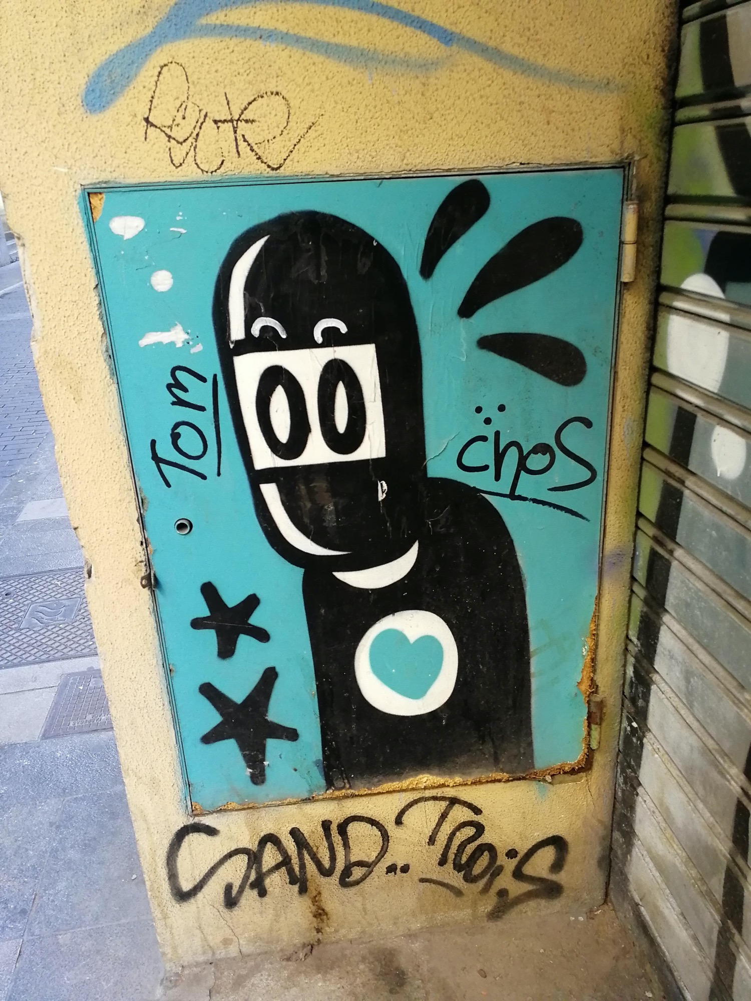 The artwork is of graffiti type. You can admire it in the city of València in Spain and more precisely here : Carrer del Músic Peydró, 12, 46001 València, Valencia, Espagne.
