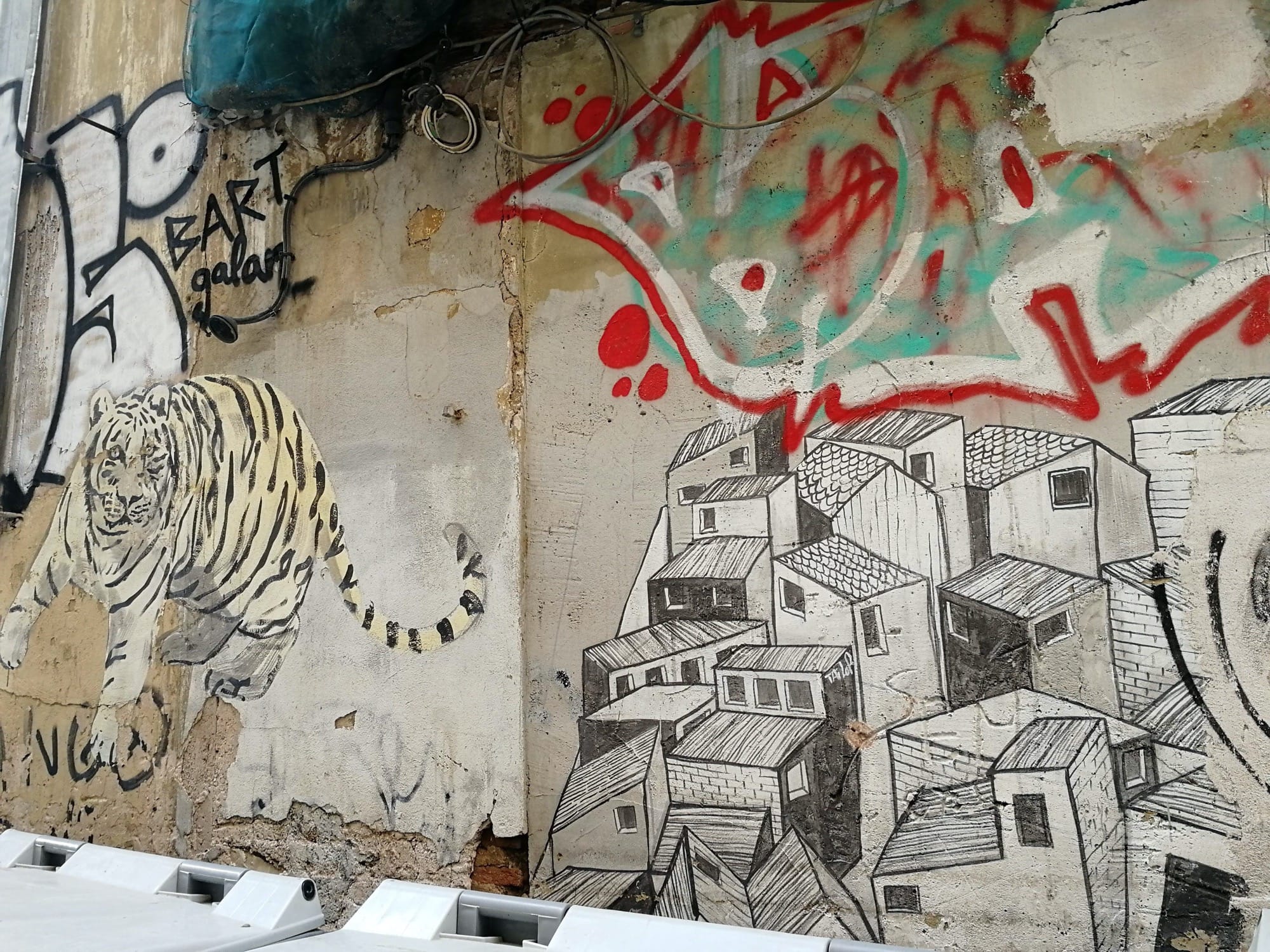 The artwork is of graffiti type. You can admire it in the city of València in Spain and more precisely here : Carrer de la Creu Nova, 7, 46002 València, Valencia, Espagne.
