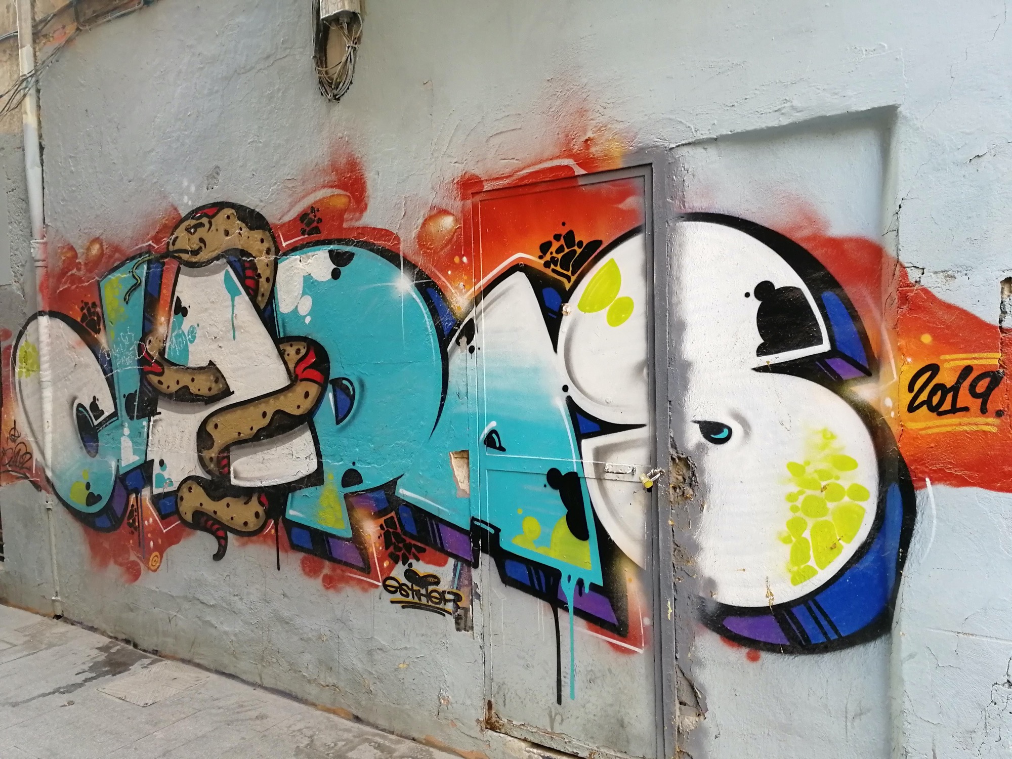 The artwork is of graffiti type. You can admire it in the city of València in Spain and more precisely here : Carrer del Pare Tosca, 3, 46003 València, Valencia, Espagne.