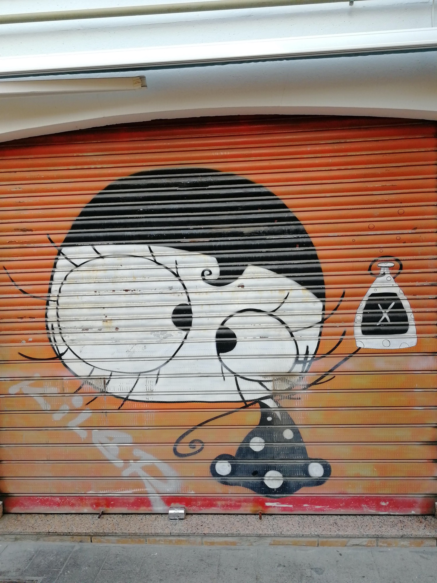 The artwork is of graffiti type. You can admire it in the city of València in Spain and more precisely here : Carrer de la Creu, 5, 46003 València, Valencia, Espagne.