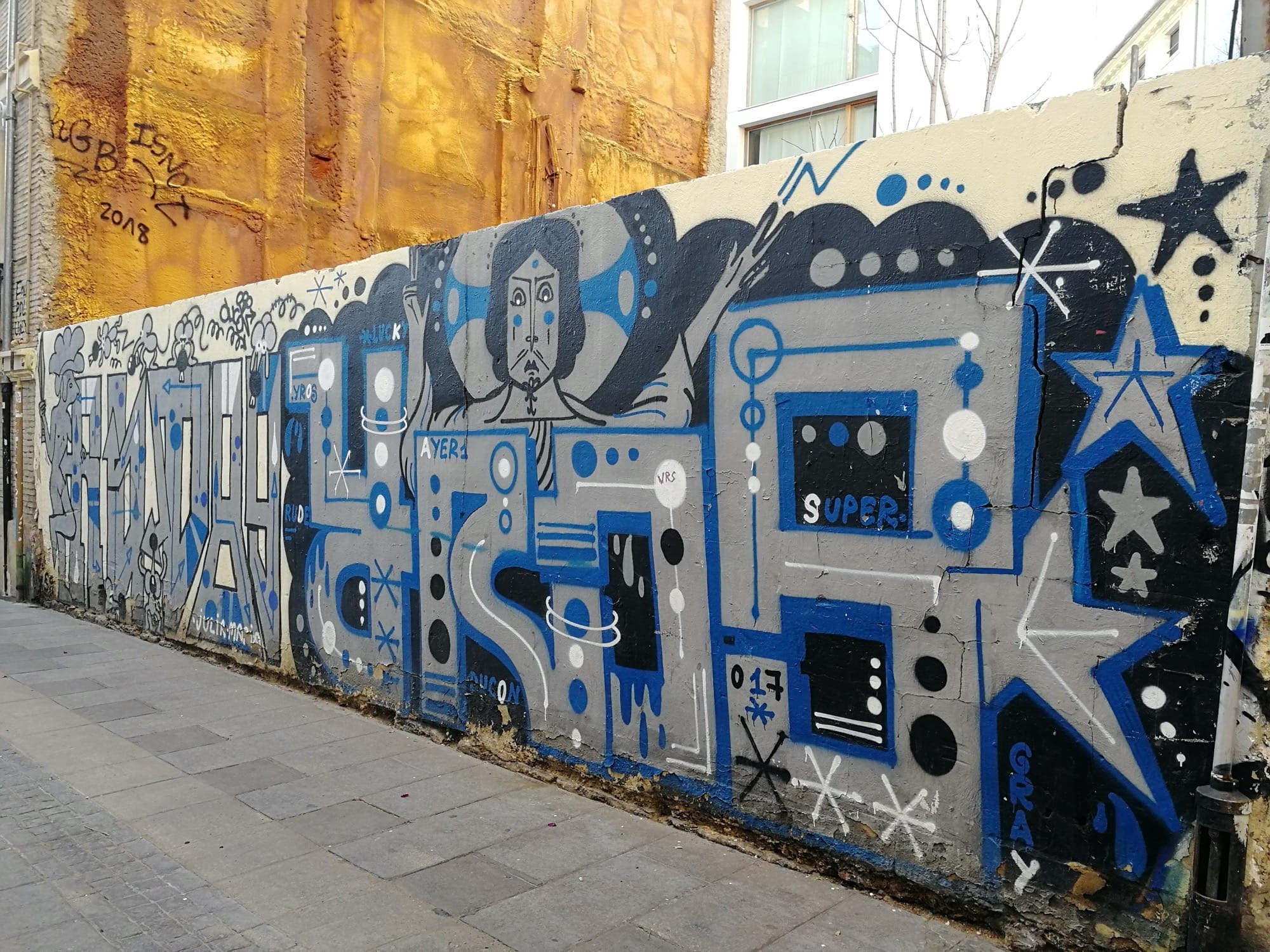 The artwork is of graffiti type. You can admire it in the city of València in Spain and more precisely here : Carrer de Sant Tomàs, 25, 46003 València, Valencia, Espagne.