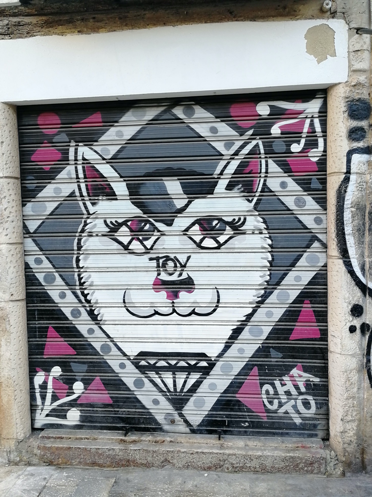 The artwork is of graffiti type. You can admire it in the city of València in Spain and more precisely here : Plaça de Mossén Sorell, s/n, 46003 València, Valencia, Espagne.