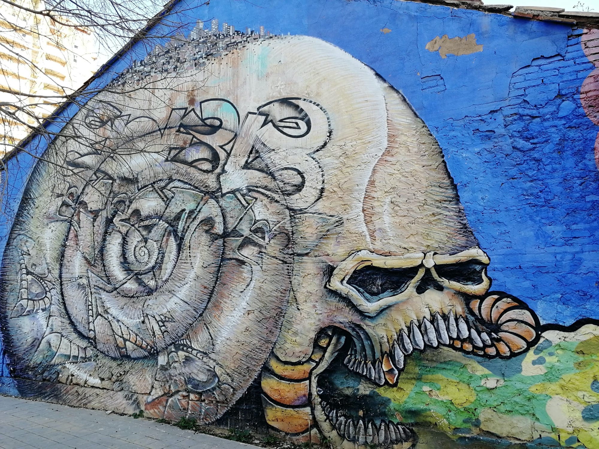 The artwork is of graffiti type. You can admire it in the city of València in Spain and more precisely here : Sant Vicent Màrtir - Enginyer Josep Sirera, 46017 Valencia, Espagne.