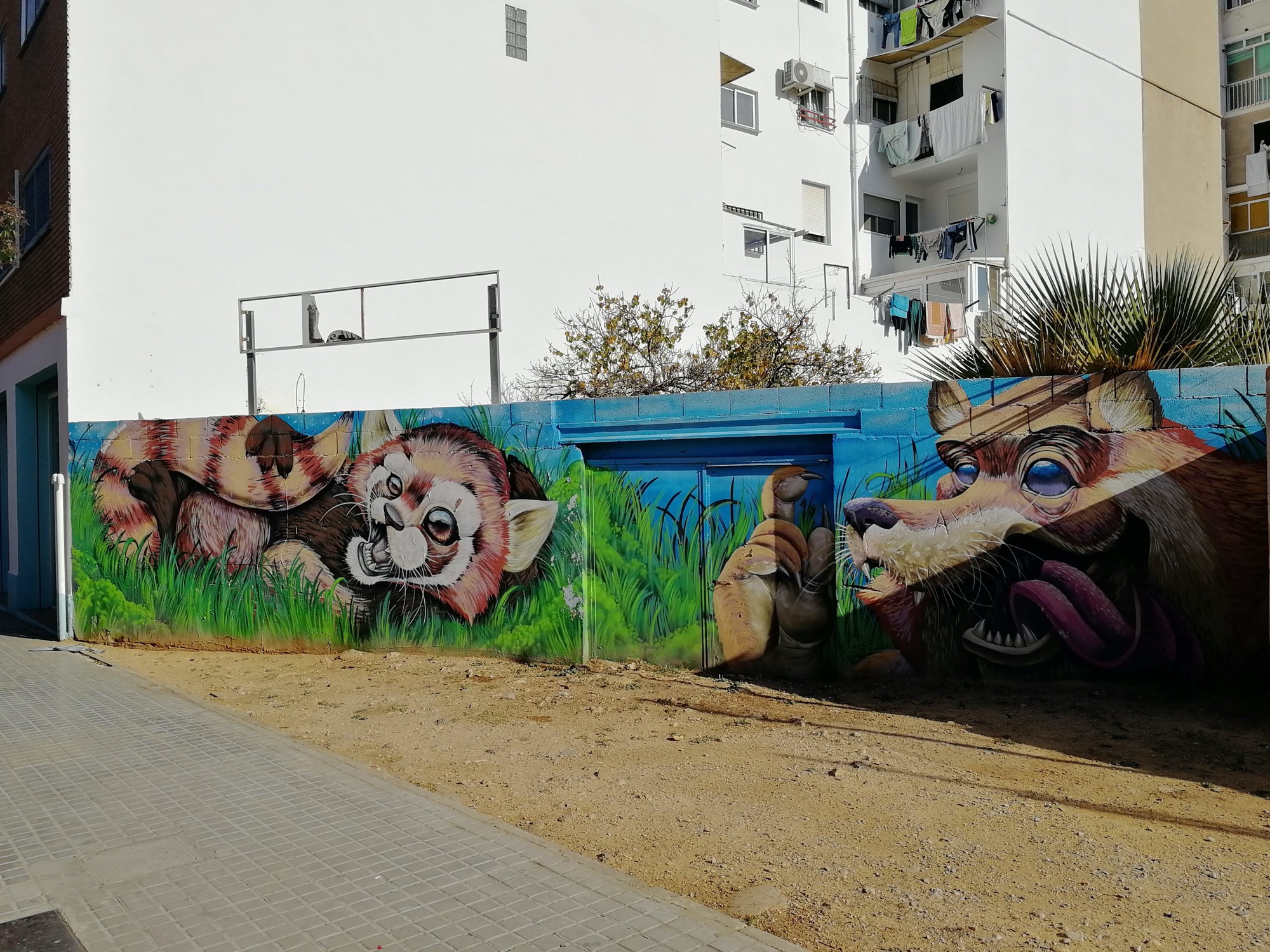 The artwork is of graffiti type. You can admire it in the city of València in Spain and more precisely here : Carrer dels Carters, 51B, 46017 València, Valencia, Espagne.