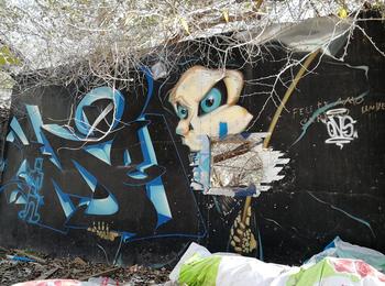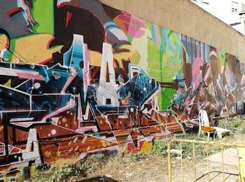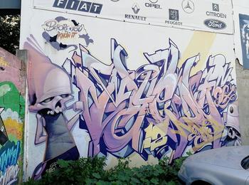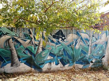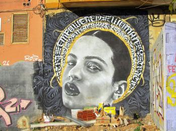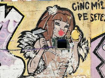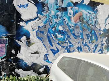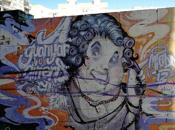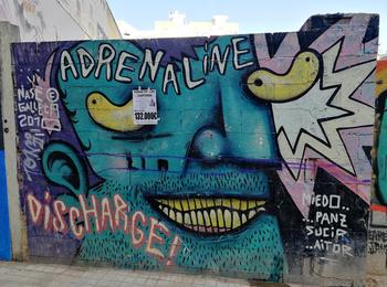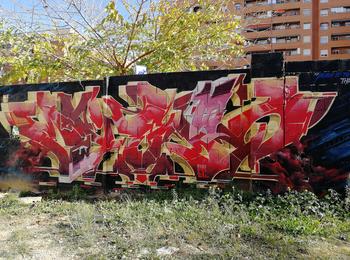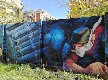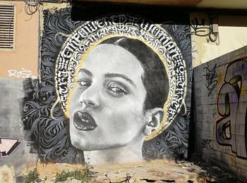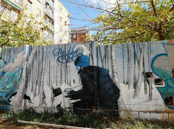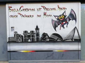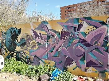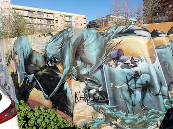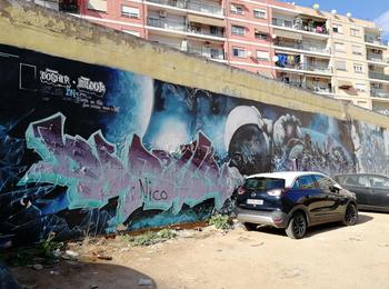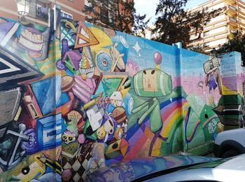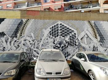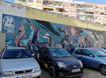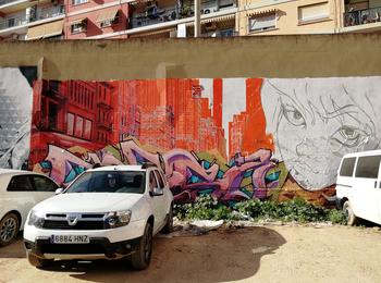 The artwork is of graffiti type. You can admire it in the city of València in Spain and more precisely here : Plaça de l'Escultor Frechina, 24, 46017 València, Valencia, Espagne.