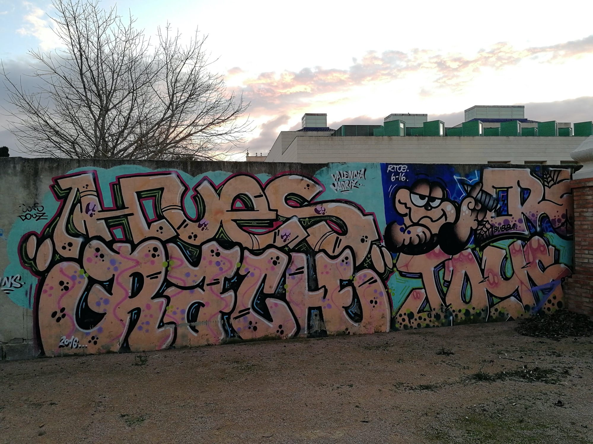 The artwork is of graffiti type. You can admire it in the city of València in Spain and more precisely here : Volta del Rossinyol, 35, 46010 València, Valencia, Espagne.