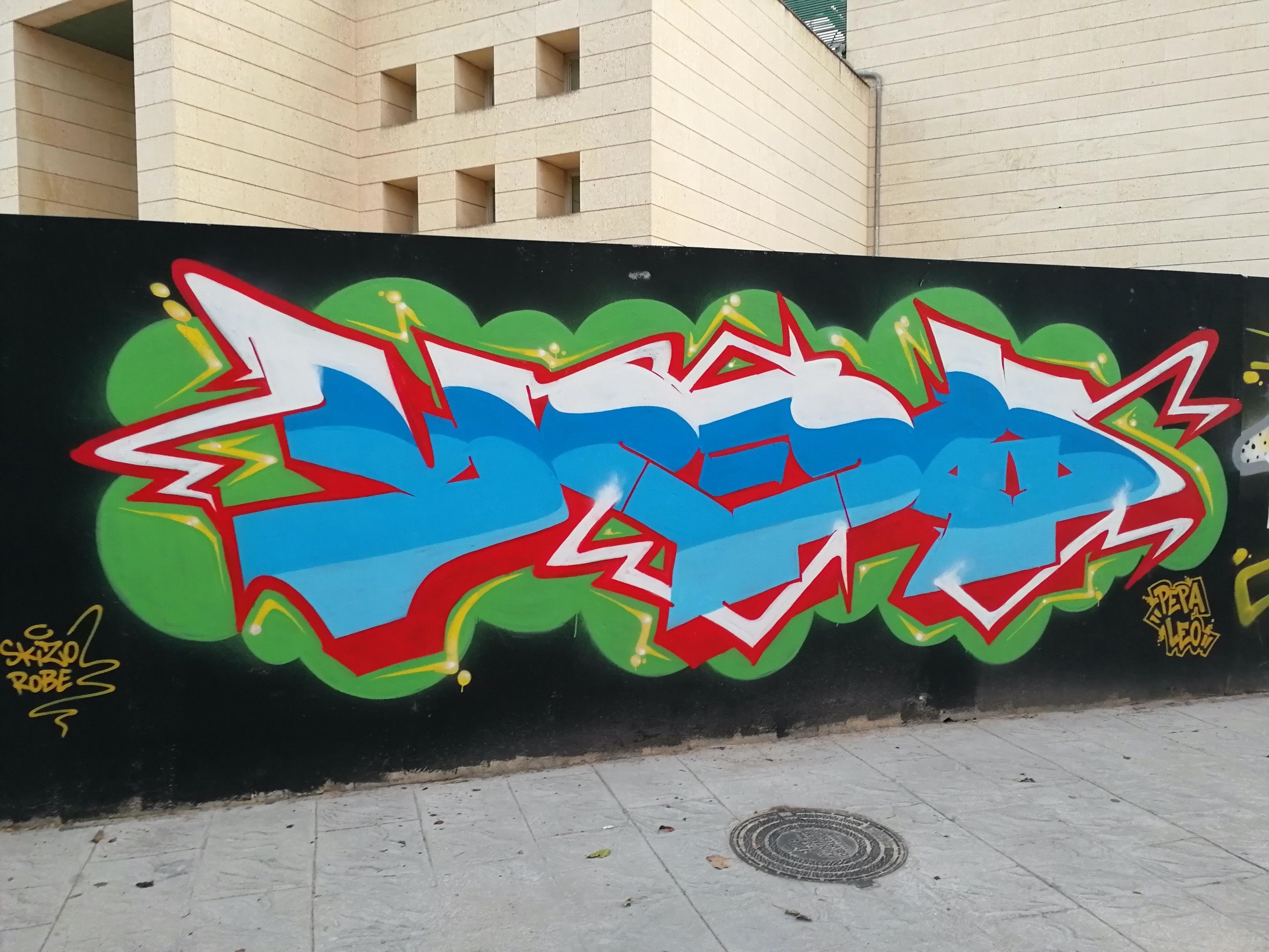 The artwork is of graffiti type. You can admire it in the city of València in Spain and more precisely here : Carrer de la Flora, 8, 46010 València, Valencia, Espagne.