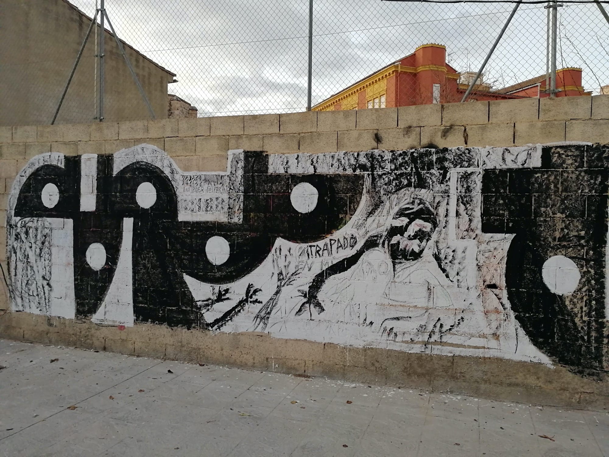 The artwork is of graffiti type. You can admire it in the city of València in Spain and more precisely here : Volta del Rossinyol, 9, 46010 València, Valencia, Espagne.