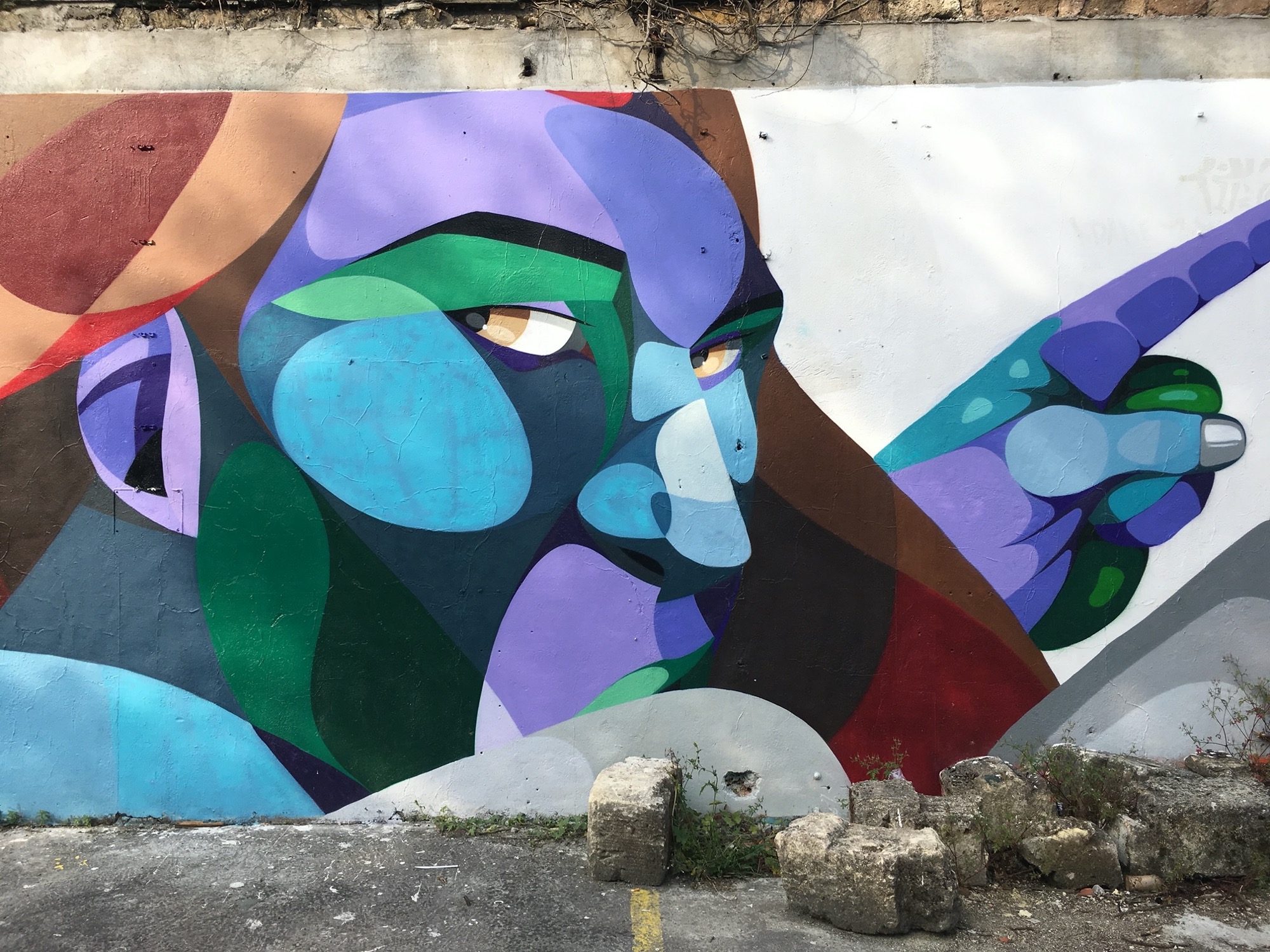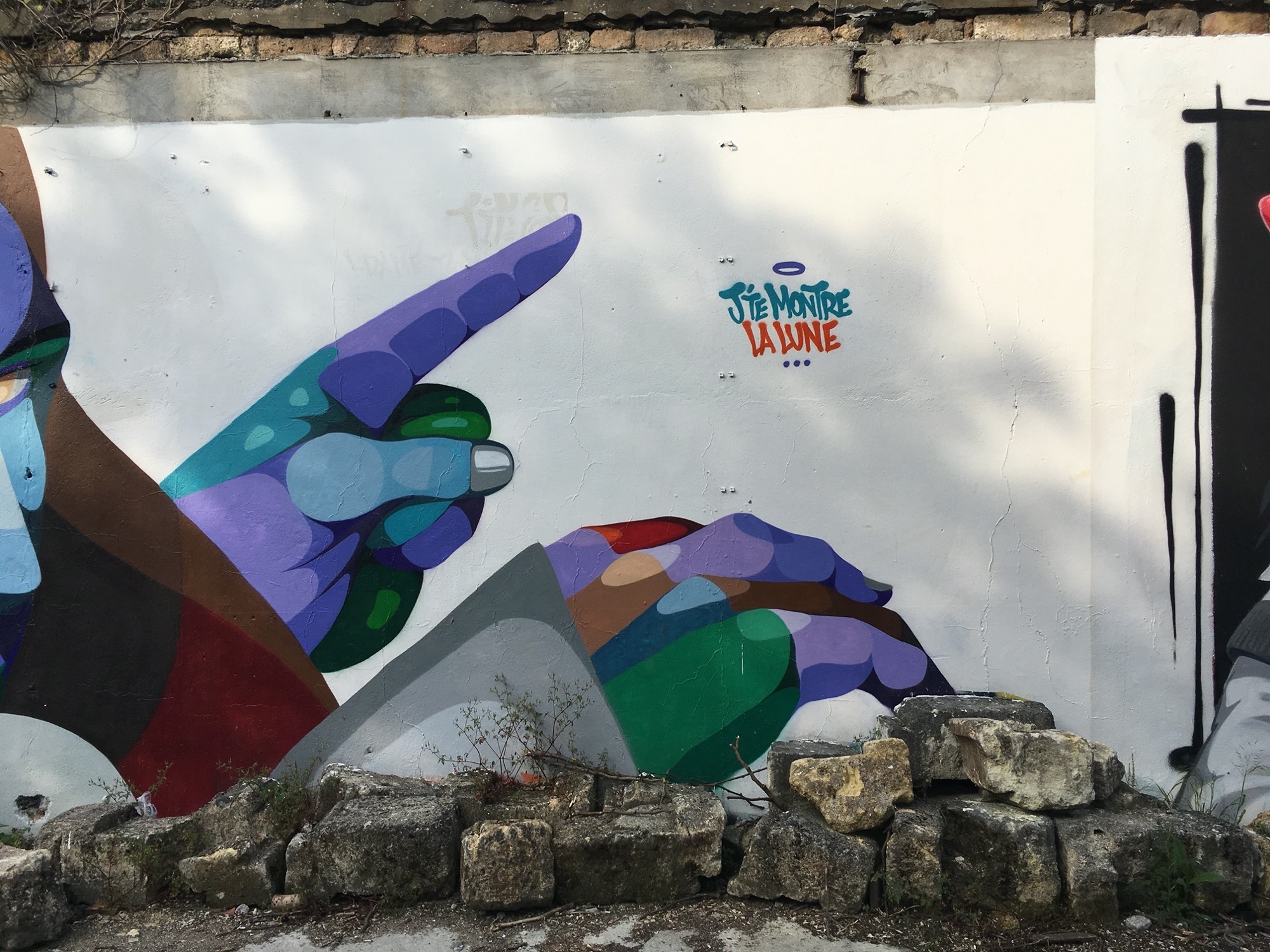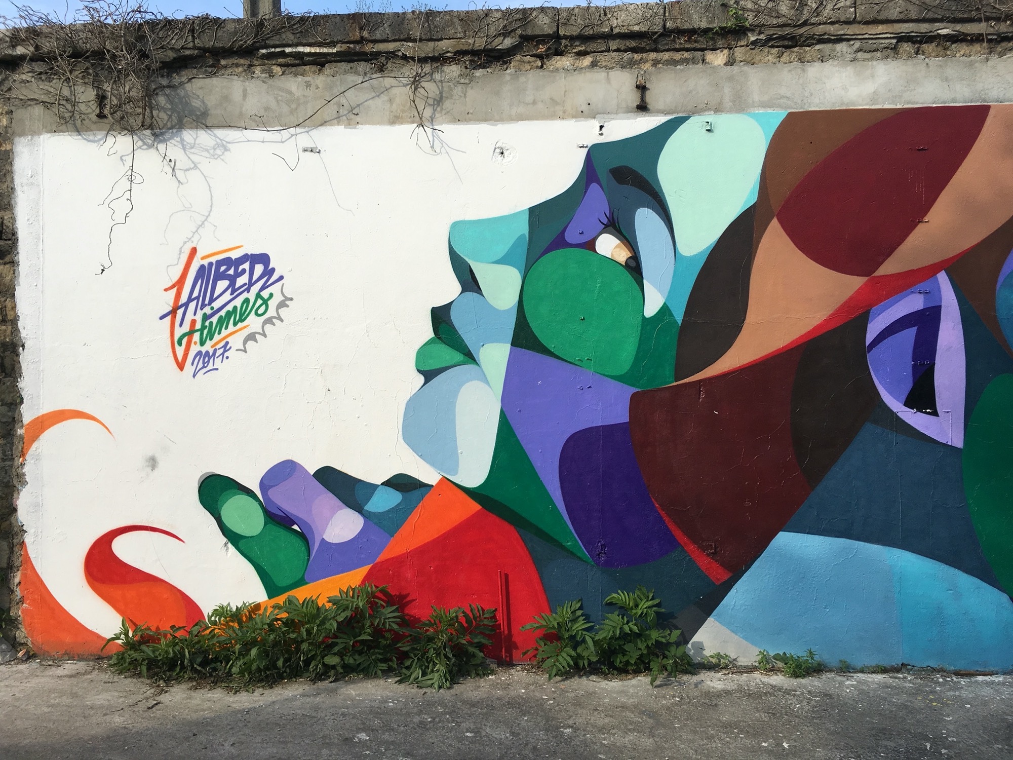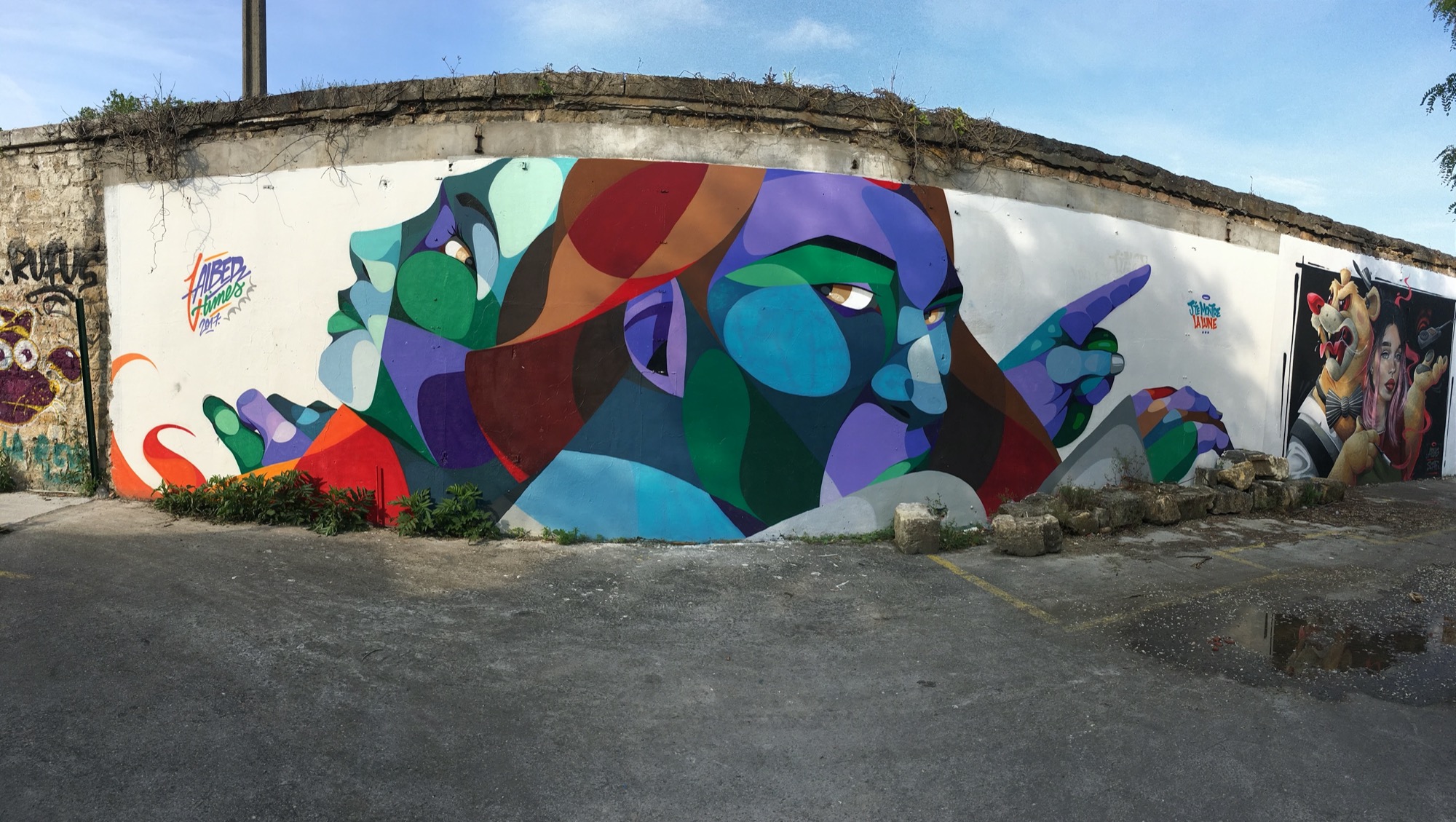 The artwork is of graffiti type. You can admire it in the city of Bordeaux in France and more precisely here : Darwin, bat. sud, 87 Quai des Queyries, 33100 Bordeaux, France.