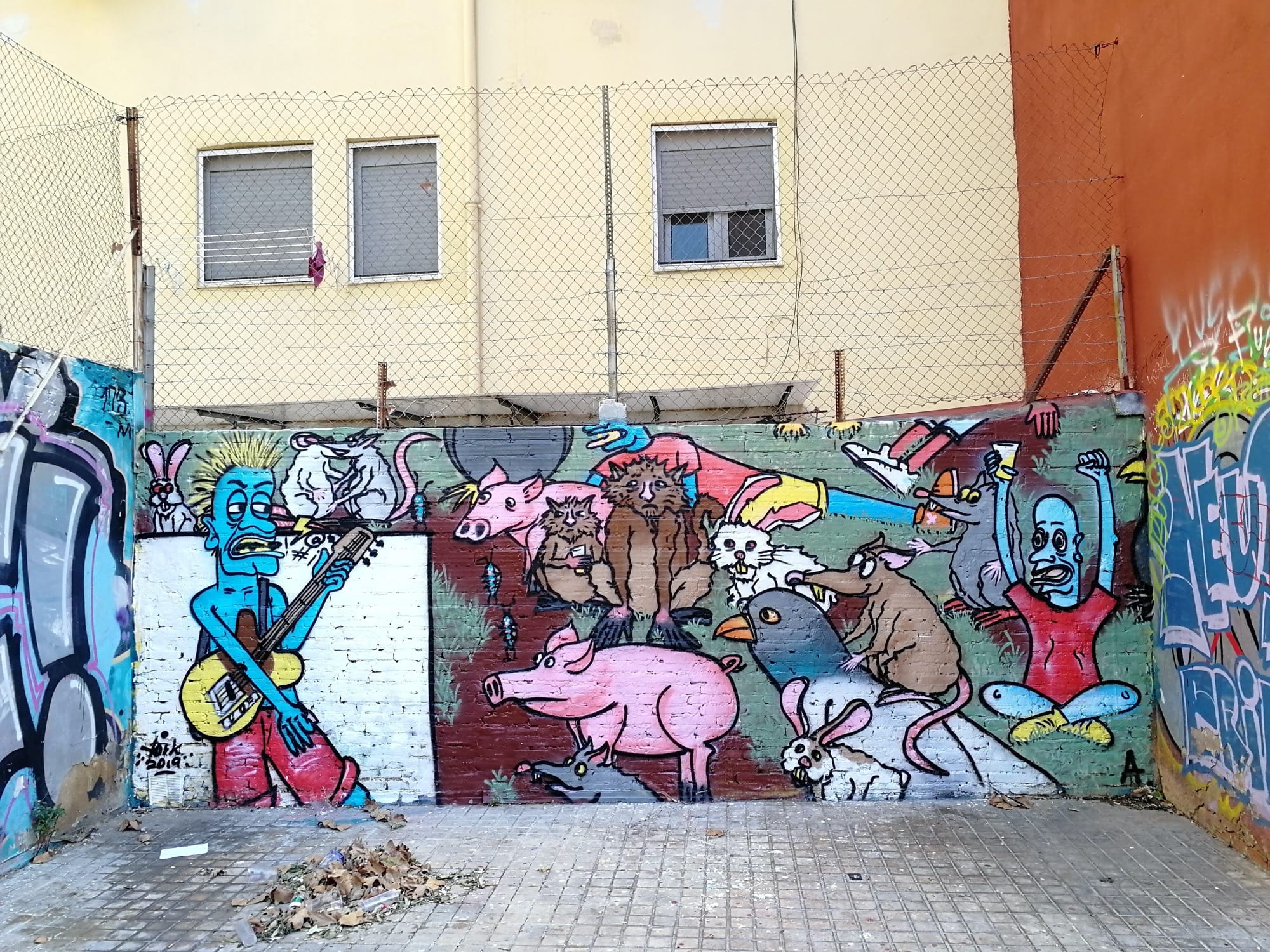 The artwork is of graffiti type. You can admire it in the city of València in Spain and more precisely here : Plaça del Cedre, 11, 46022 València, Valencia, Espagne.