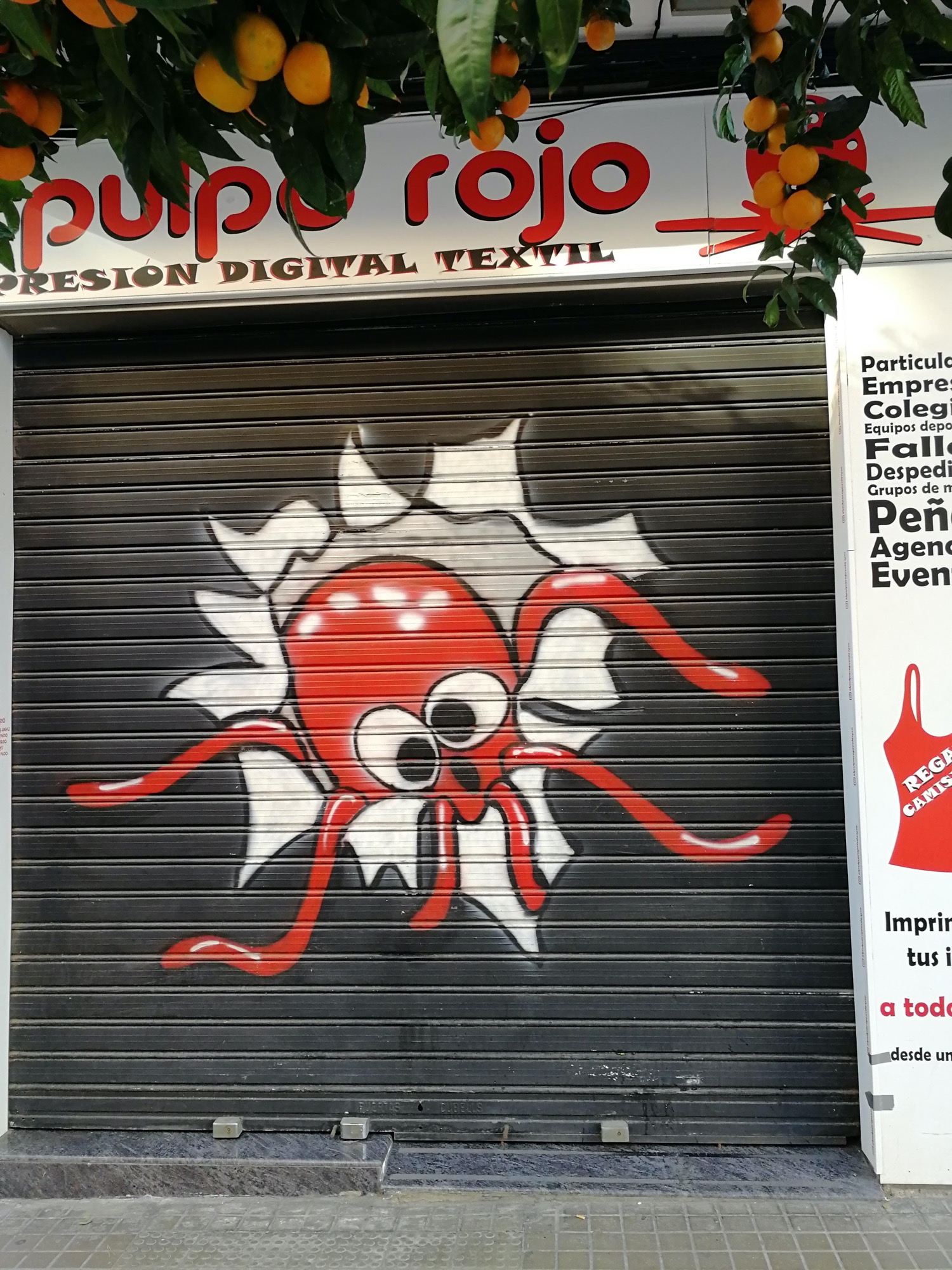 The artwork is of graffiti type. You can admire it in the city of València in Spain and more precisely here : Carrer del Poeta Mas i Ros, 34, 46022 València, Valencia, Espagne.