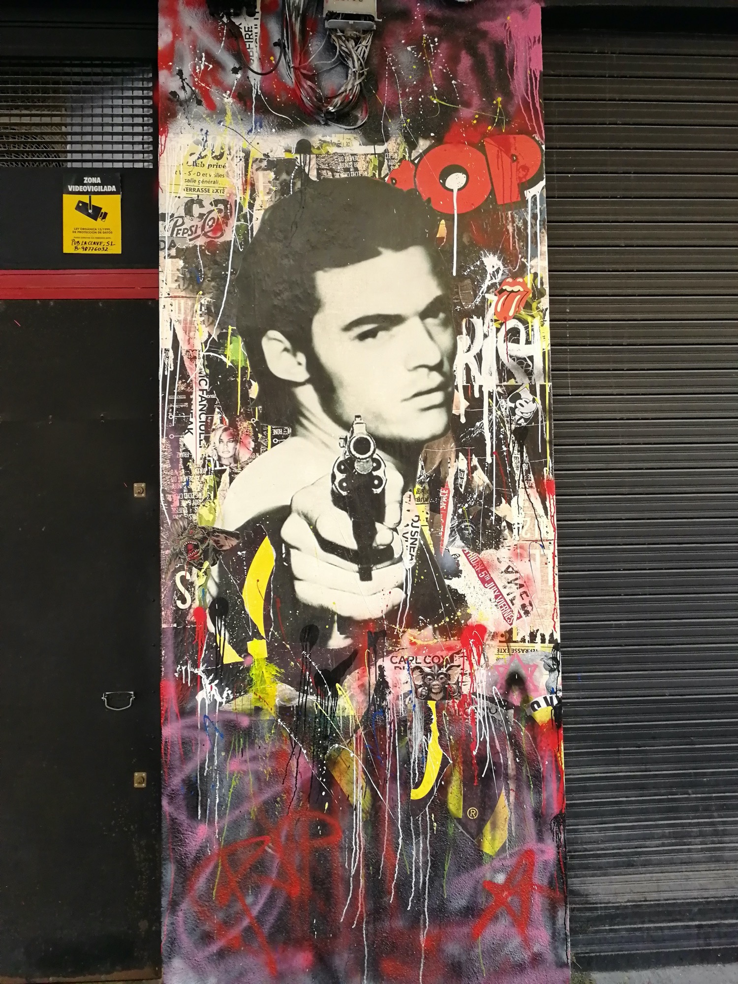 The artwork is of graffiti type. You can admire it in the city of València in Spain and more precisely here : Carrer de Zarra, 1, 46022 València, Valencia, Espagne.